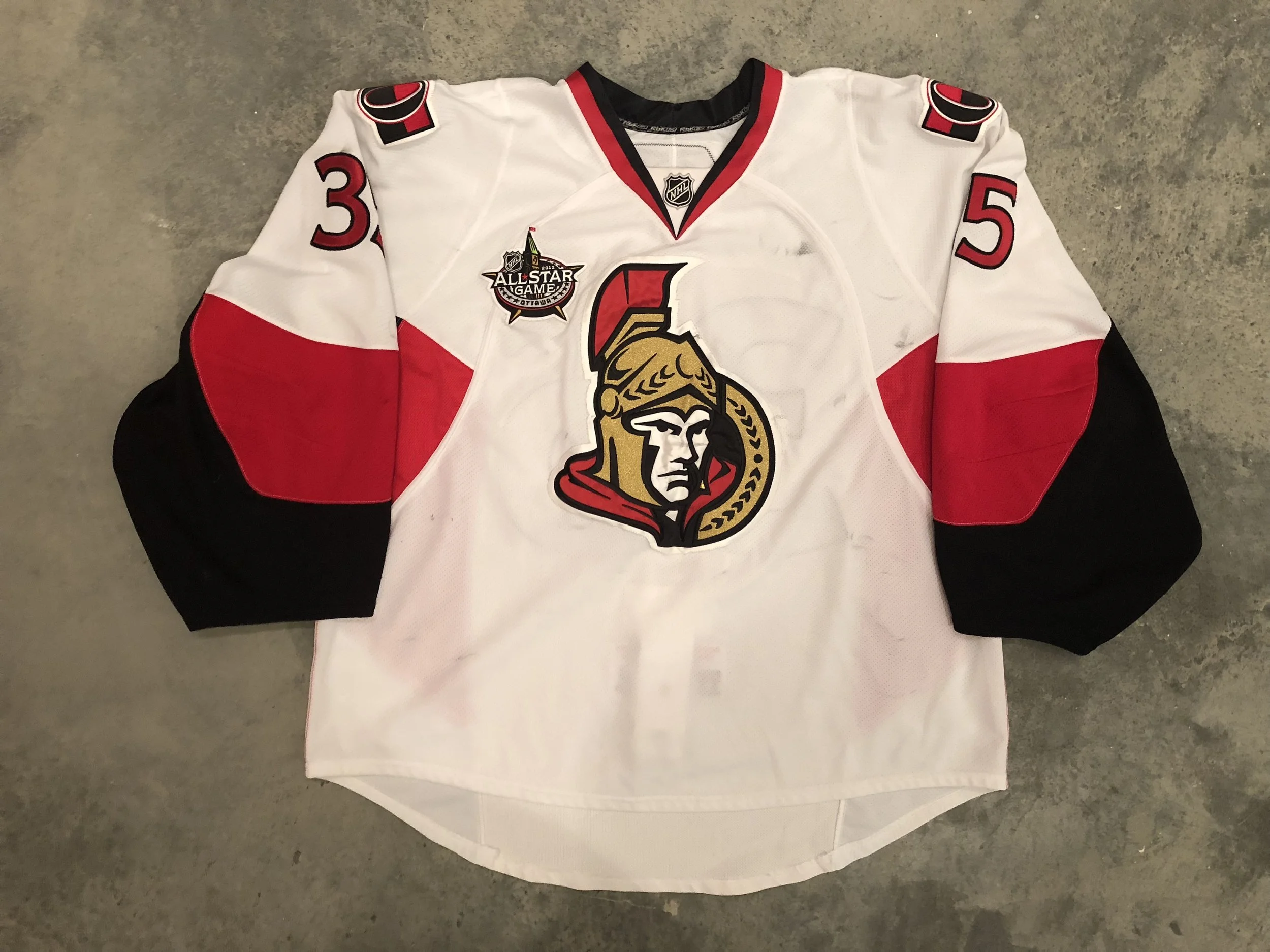 Description: This jersey shows great wear with tons of puck marks and a couple of nice repairs, with one by the crest and one on the body near the hem. The jersey has been photomatched to images throughout the first half of the season, with the puck mark on the crest visible from early on, and additional puck marks and even the repair by the crest visible on later photos. The 2012 NHL All Star Game adorns the right chest.