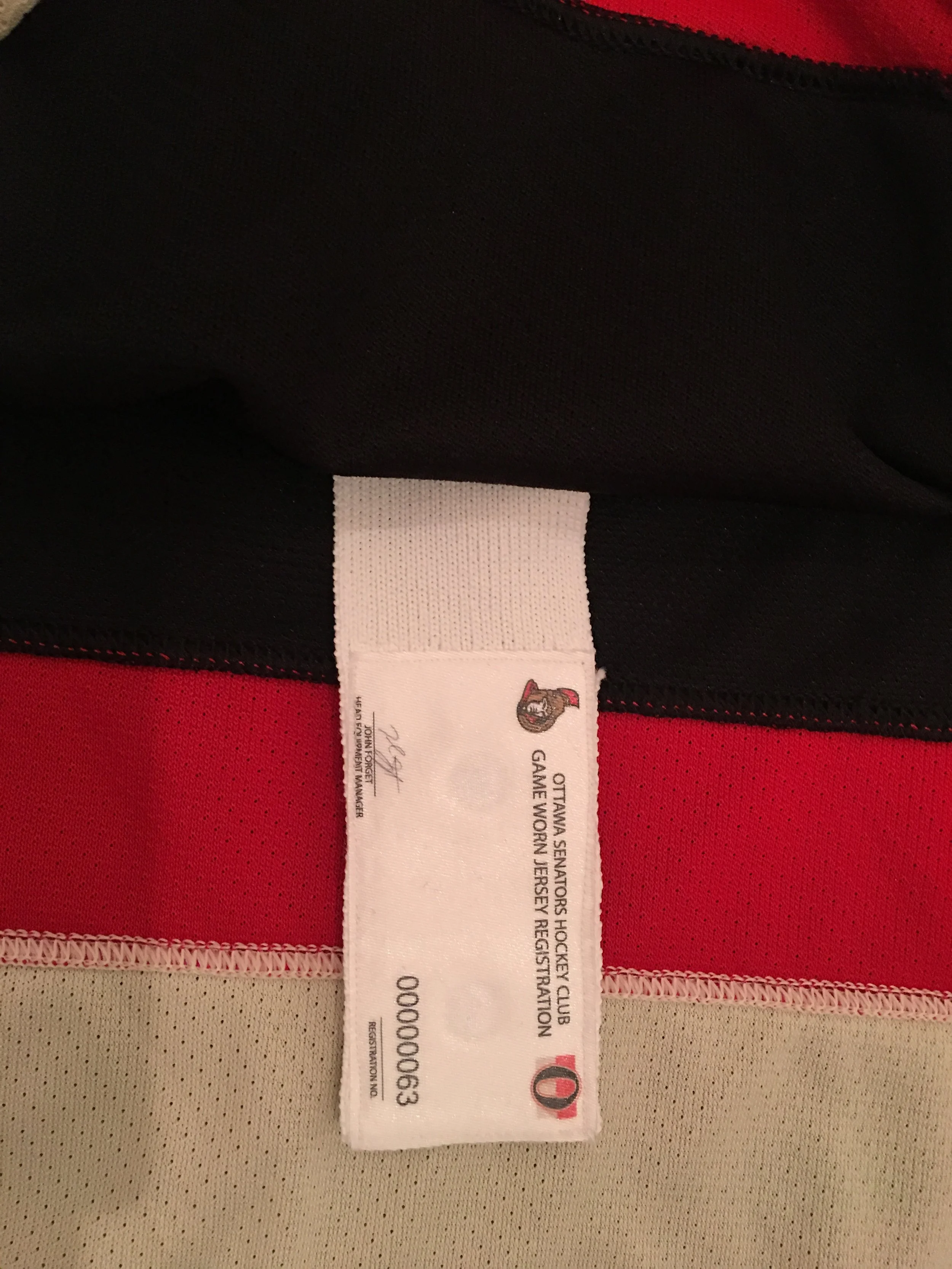 Description: This great two patch Heritage jersey was worn by Hammond throughout the season. The jersey show very light wear with a couple marks visible, but has been photomatched. The Senators 25th anniversary patch adorns the right chest. and the NHL Centennial patch is on the right sleeve.