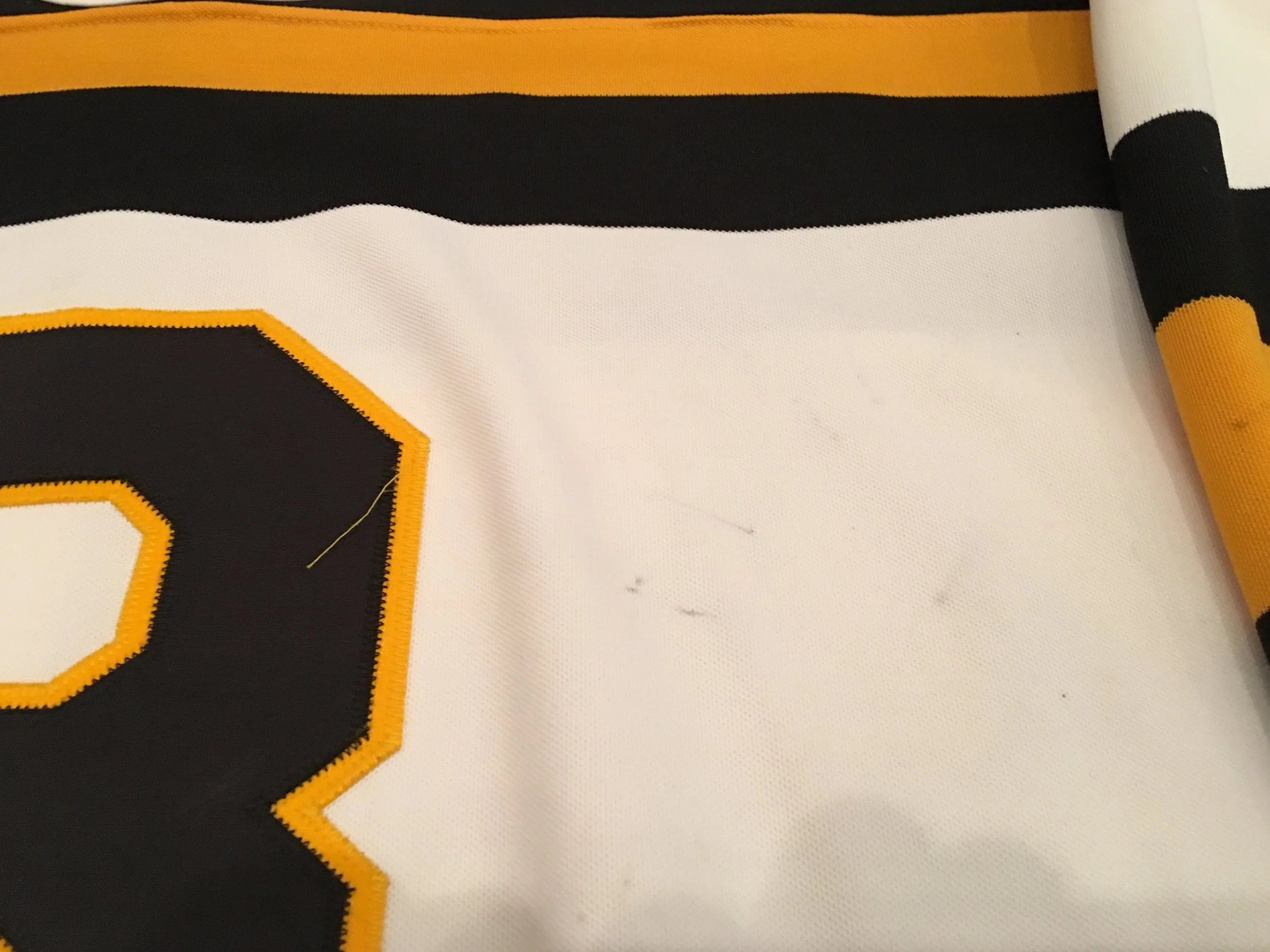 Description: This beautiful TBTC Bruins jersey shows light wear with a few visible marks and nice post paint on the sleeves. The jersey is photo matched to the puck marks to the right of the crest, the loose thread on the crest, and the placement of the NHL 75th anniversary patch. The other TBTC Moog jersey has the patch placed much higher. These rare throwback jerseys are really awesome.