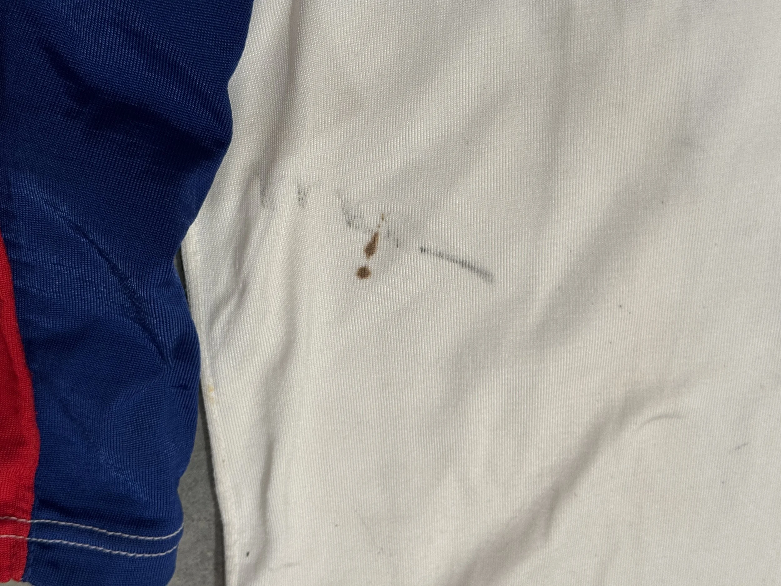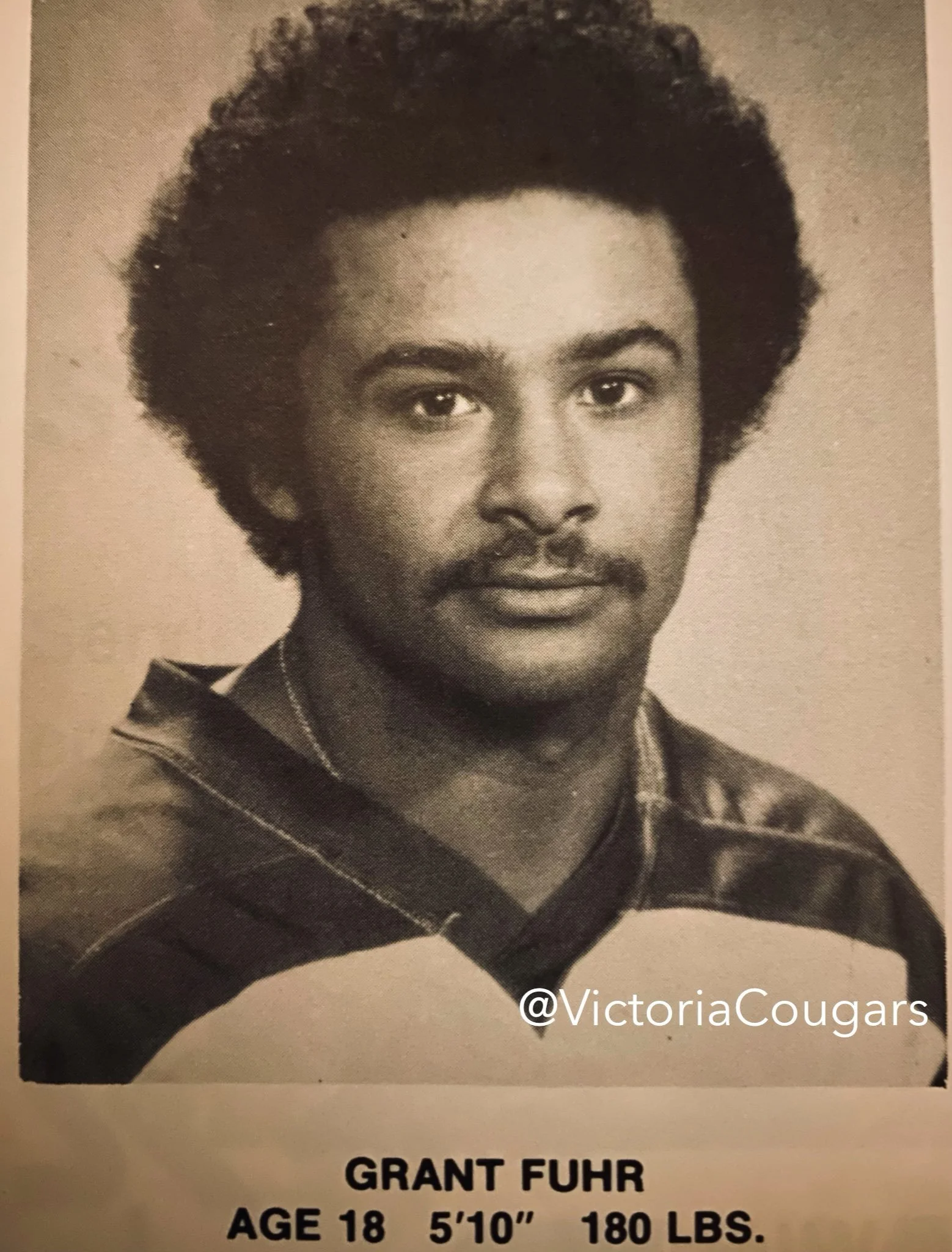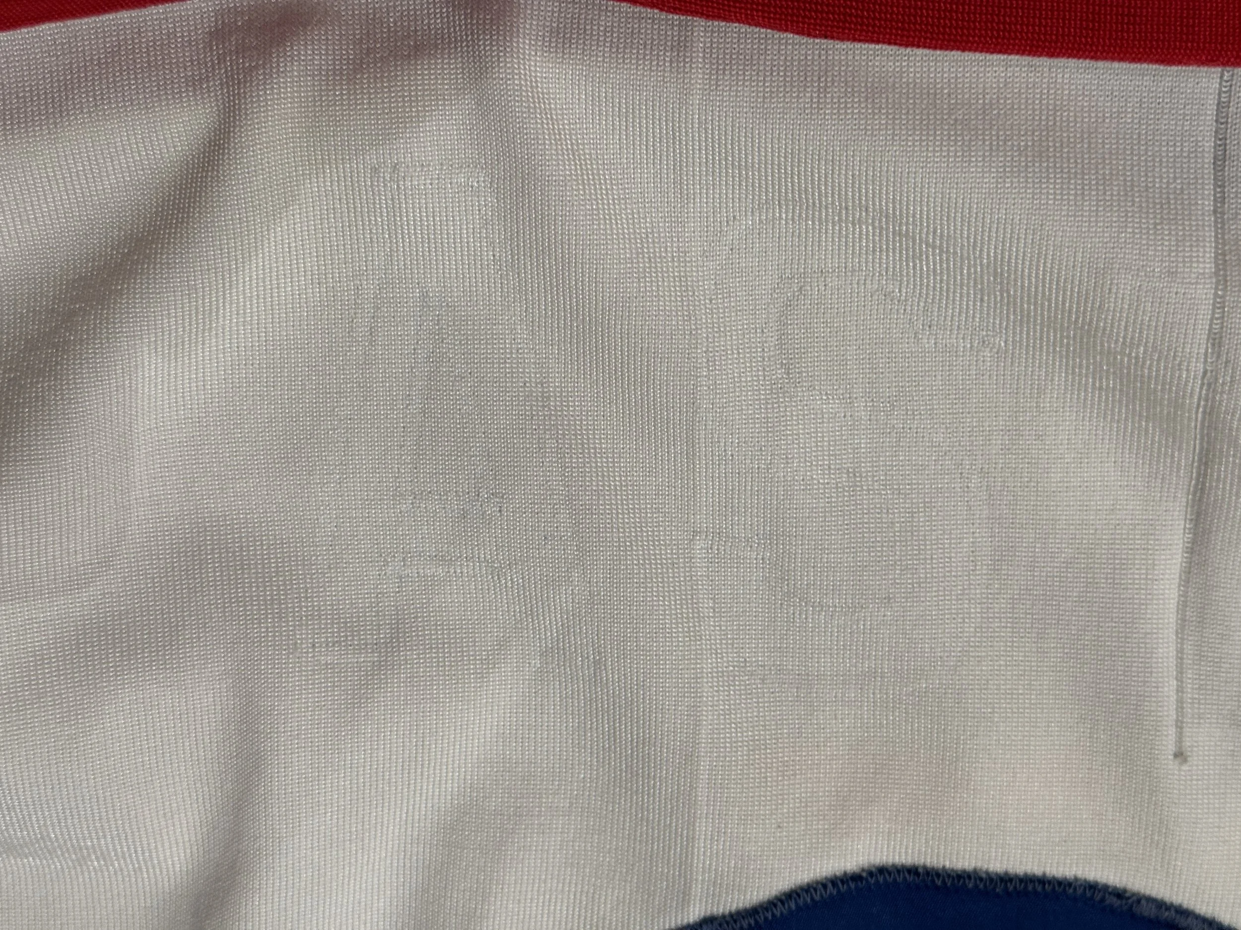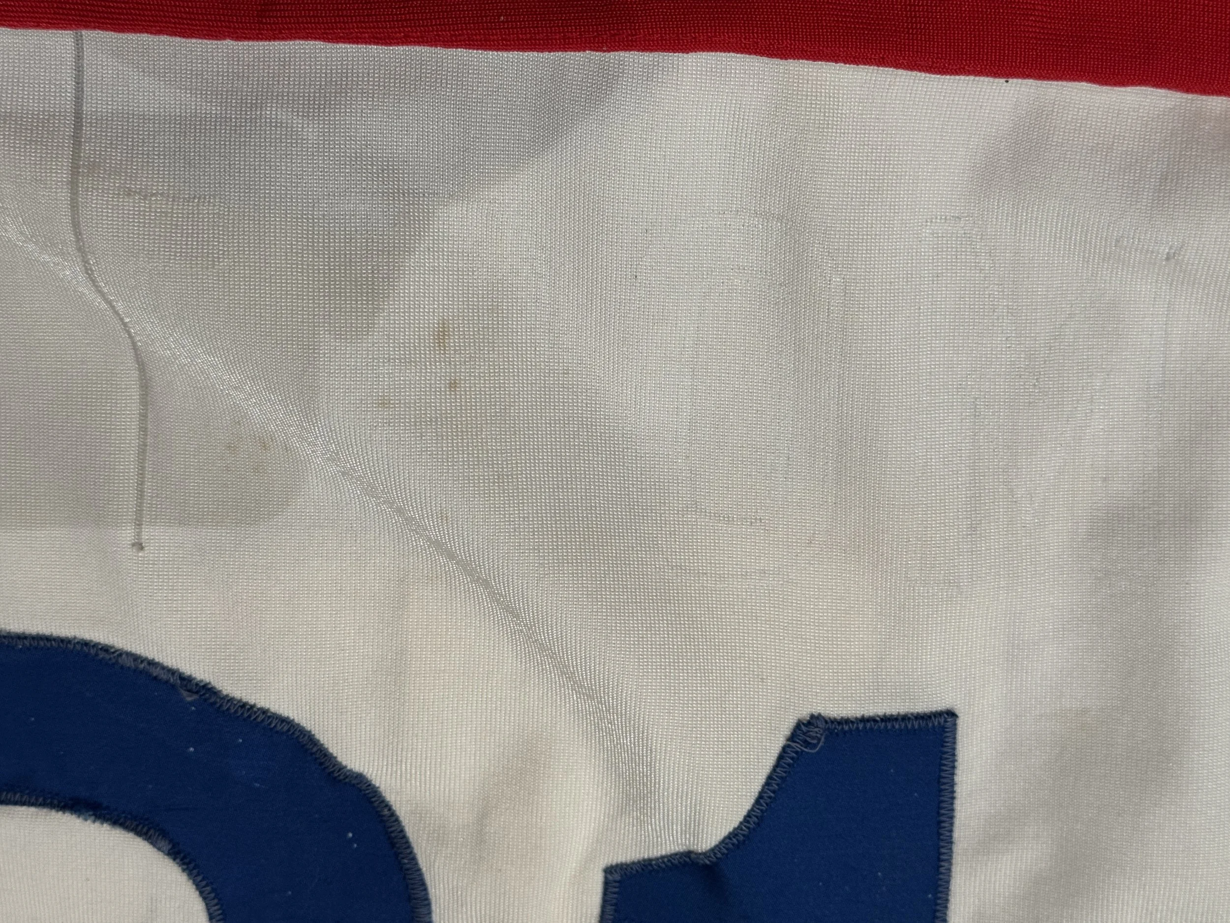 Description: This unique jersey was originally a shield style New York Rangers jersey worn by Hardy Astrom in the 1977-78 season. Astrom only played 4 games for the Rangers that season and then moved on the Rockies organization. The jersey shows a very clear outline of the removed Rangers shield crest and of Astrom’s name previously stiched on the back. The jersey was then recycled to the Victoria Cougars, where it was worn by HOF goalie Grant Fuhr in WHL. Fuhr played 43 games that season, compiling a 30-12 record with a 3.14 GAA and a .911 save percentage. The jersey shows very nice wear, with lots of puck marks, several repairs, and some pulls in the durene fabric.