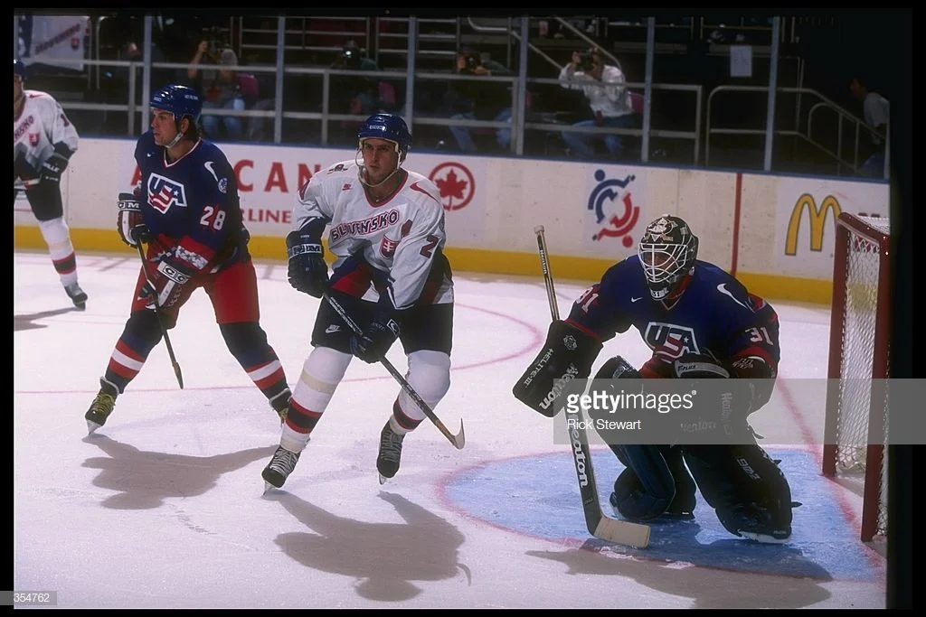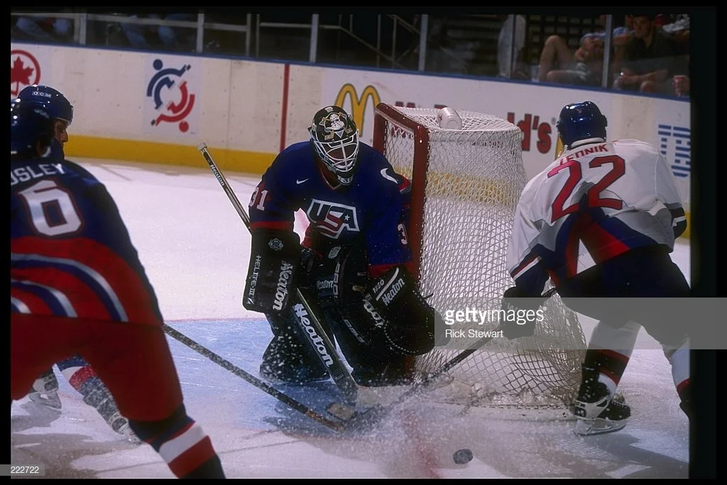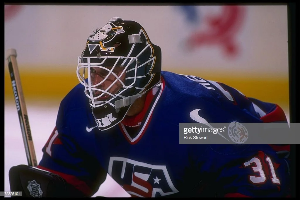 Mike Richter stole the lion's share of the limelight during the 1996 World Cup of Hockey but Guy Hebert was the goaltender of record on September 3rd against Slovakia. Guy played in net for all 60 minutes of the match and let in three for the 9-3 Team USA win. His number "31" uniform is tagged in the neck in size 58 and displays very light wear with a couple of material pulls.