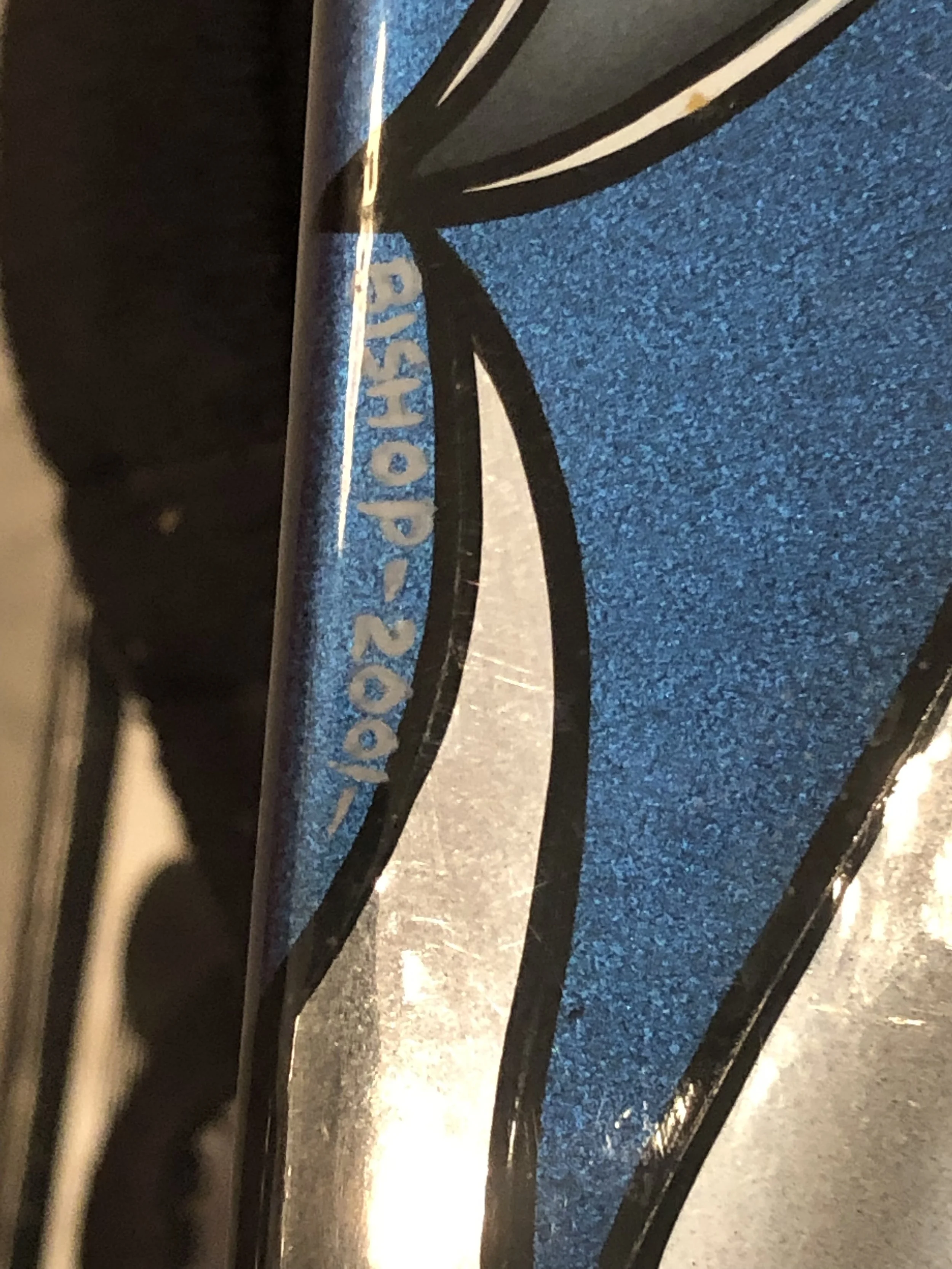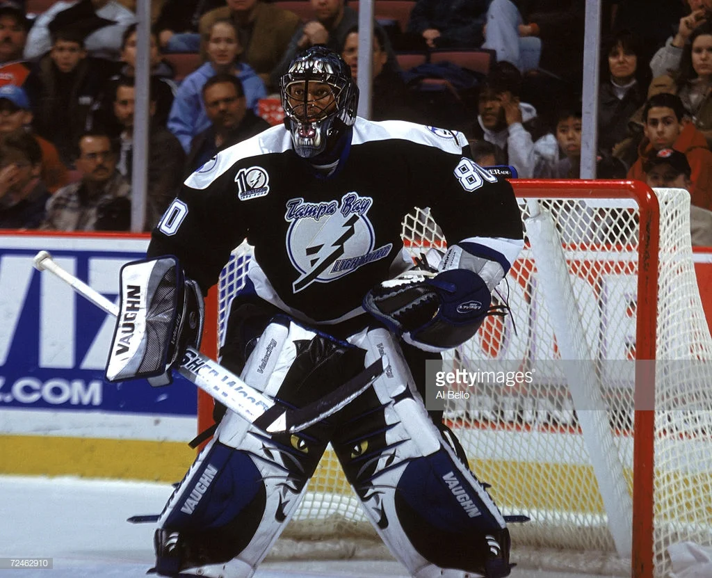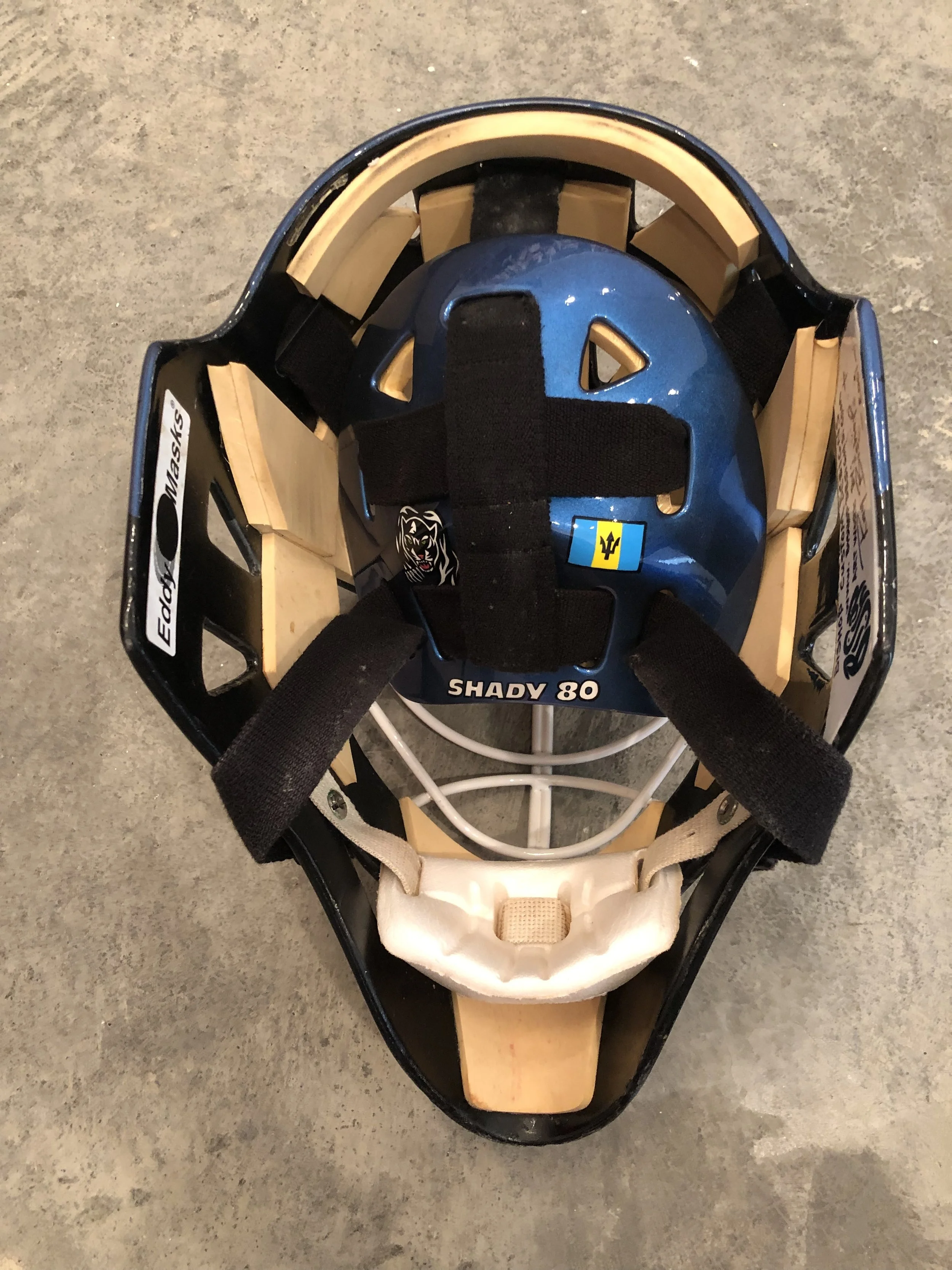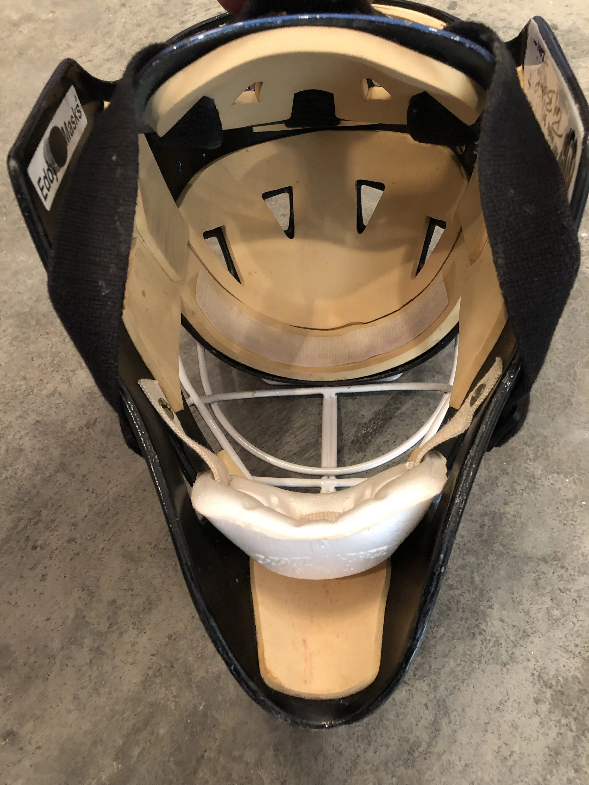Description: This great mask was worn by Kevin Weekes during his time with the Lightning. The paint job by Bishop Designs features a detailed black panther with glowing yellow eyes and metallic silver detailing. The mask was worn by Weekes for a shorter period of time, but shows nice usage.
