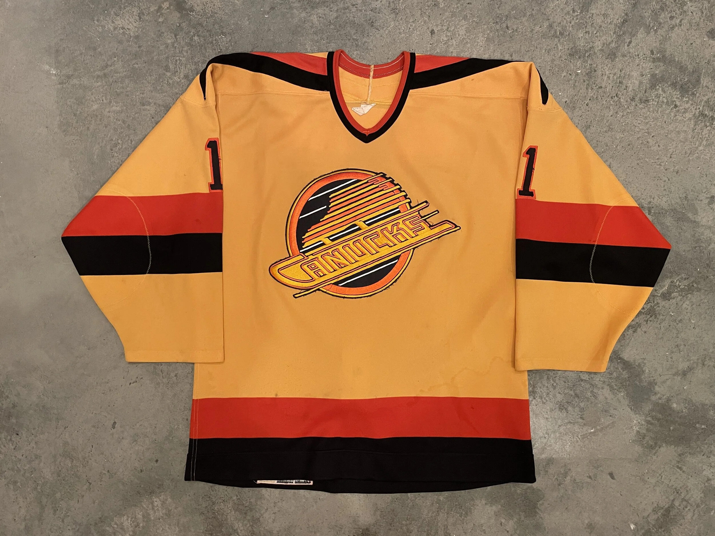 Description: One of my favorite jersey styles, this jersey shows moderate wear. The "v" shoulder style jerseys are getting tougher to find. 1987-88, his true rookie year, was McLean's first year in Vancouver where he spent 11 seasons. The small C on the nameplate looks like it was made by cutting an S and turning it sideways. This jersey came from another collector and is photomatched to the loose thread on the right shoulder yoke and fraying of the numbers on the right sleeve.