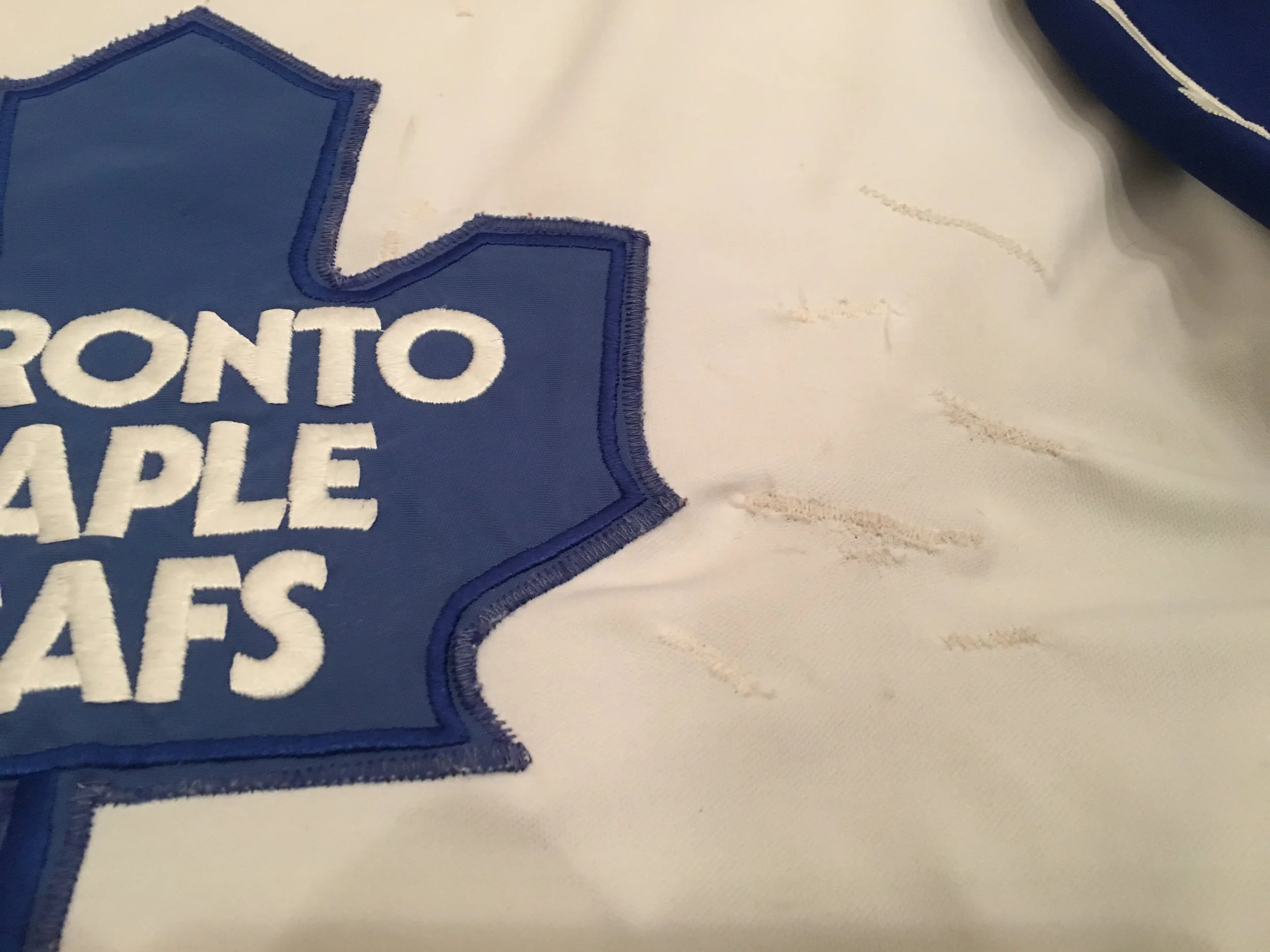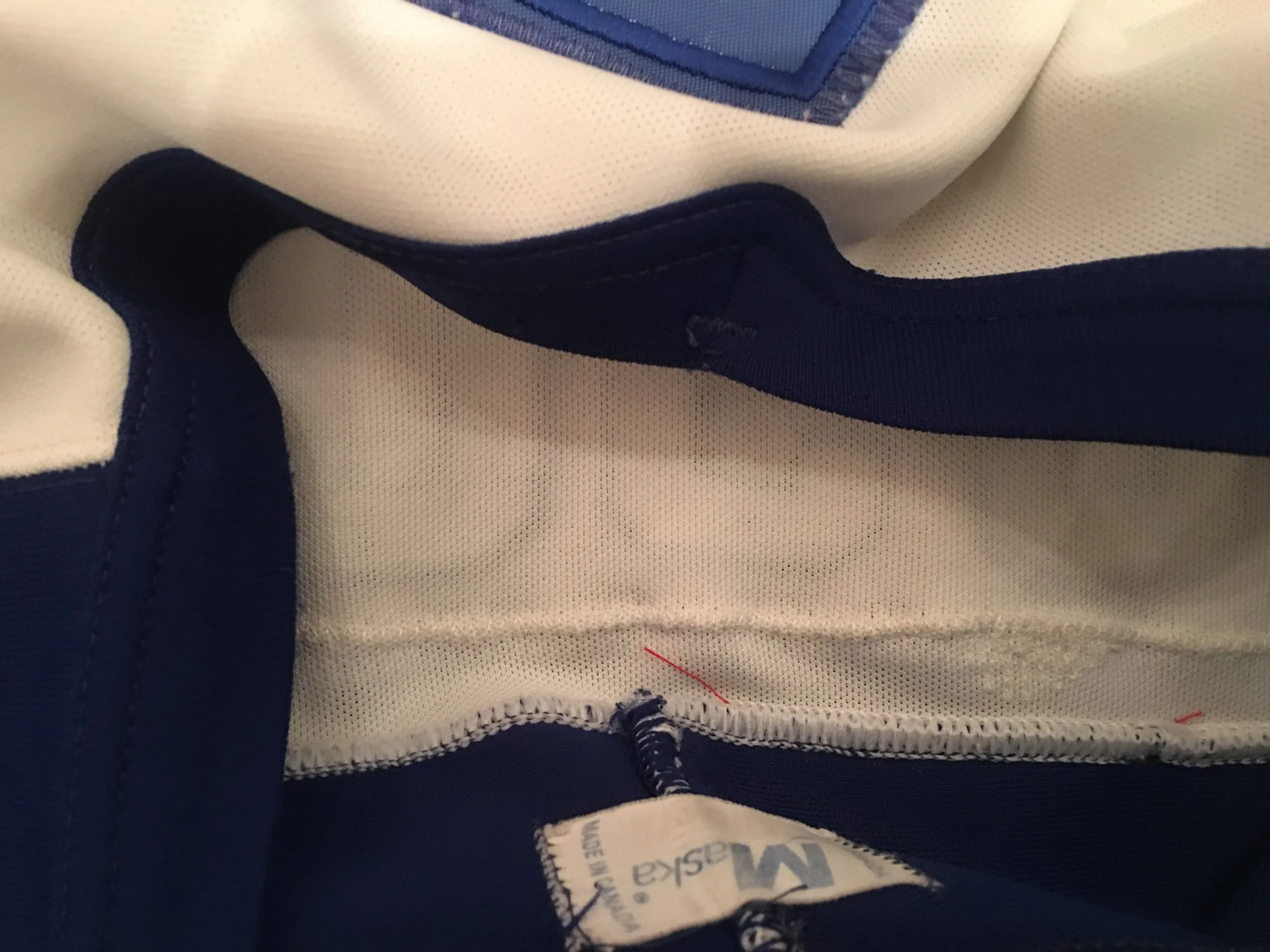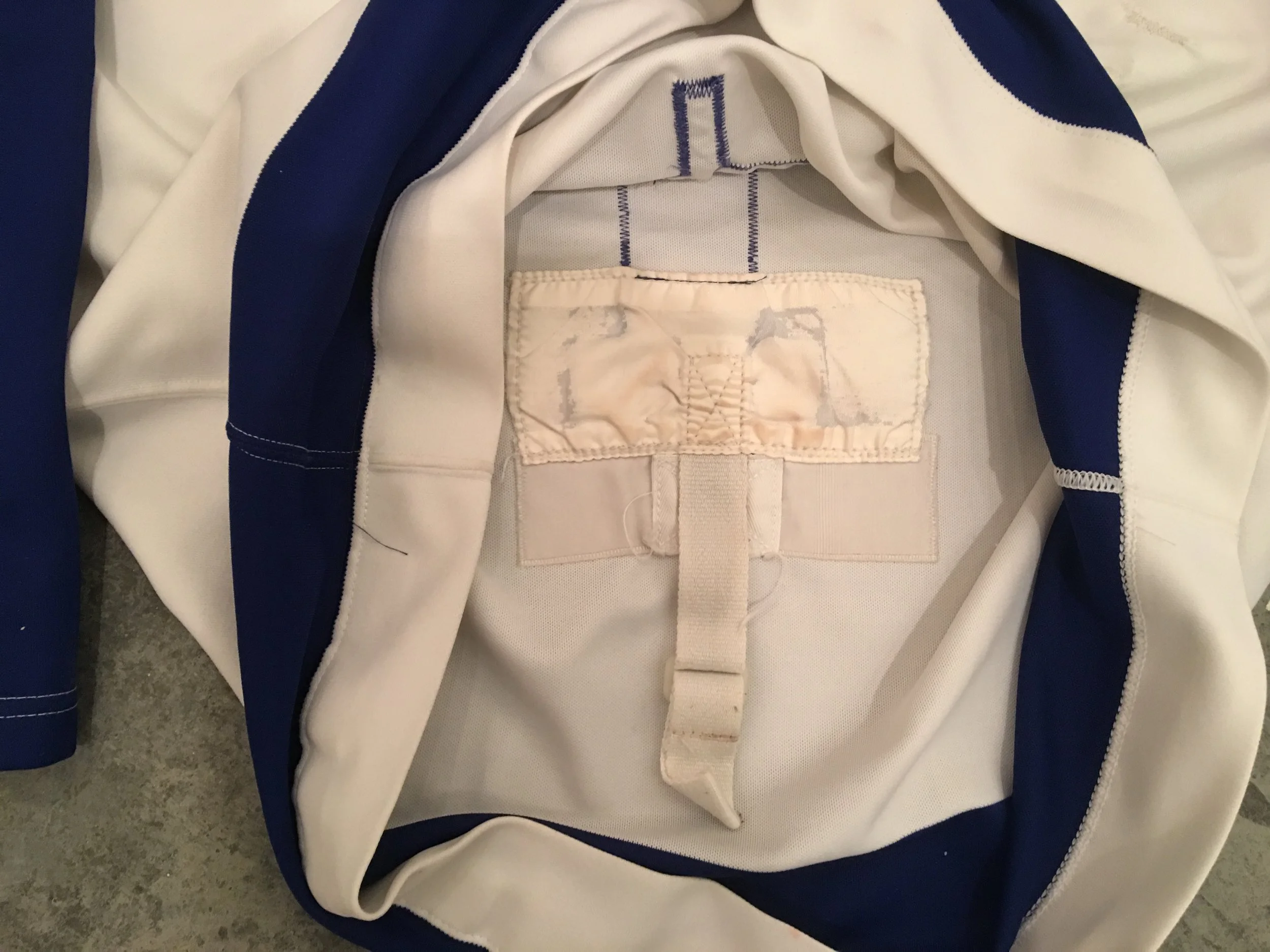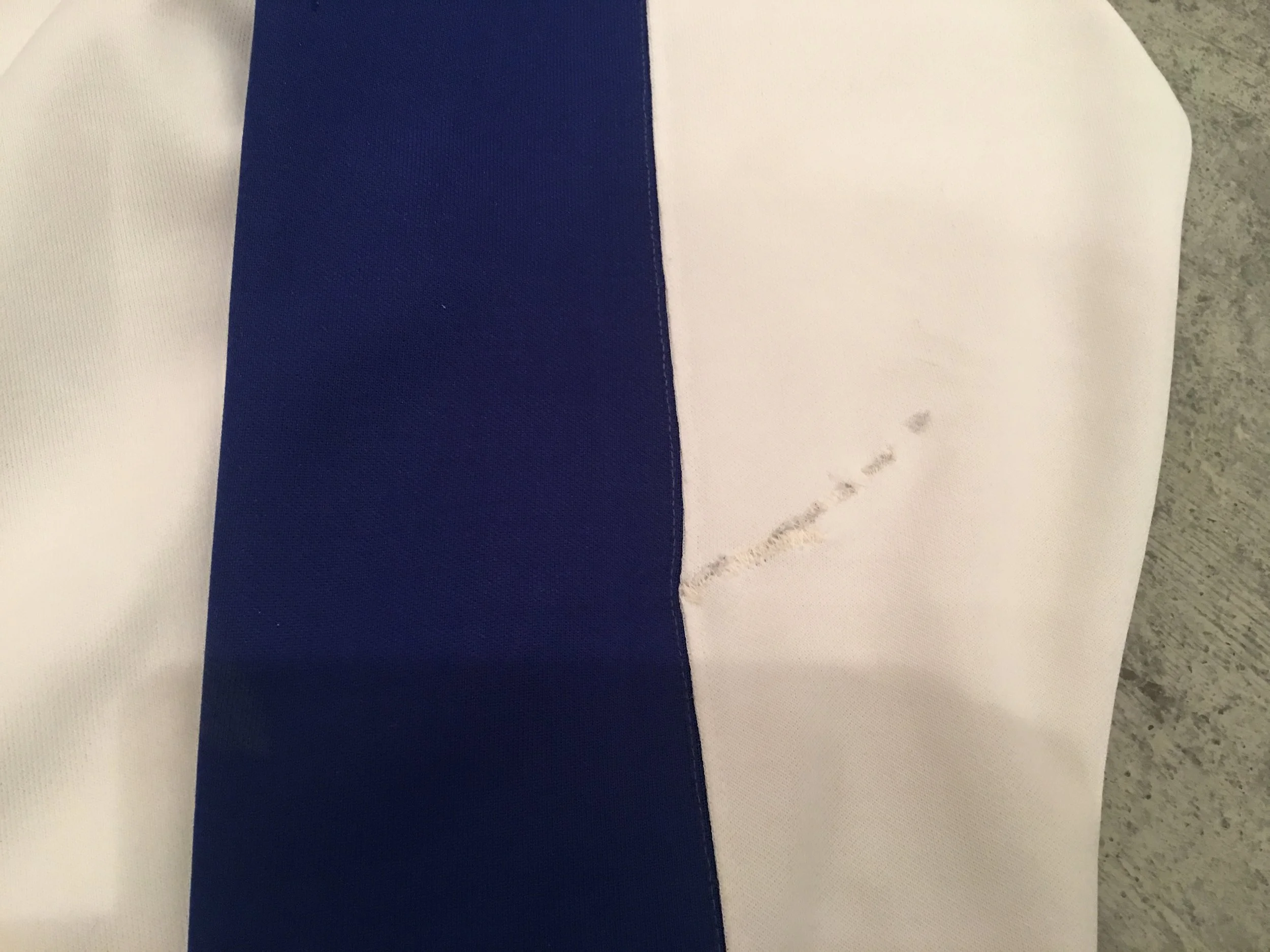Description: This jersey from a four time Vezina winner shows amazing wear. It appears to have been recycled, as the nameplate has either been replaced or reattached, and the crest has been sewn over with a larger crest to account for the shrinking of the original crest. The fight strap has even been replaced. There are over a dozen long team repairs on the front of this jersey and more on the sleeves. It appears these thinner Maksa ultrafil jerseys didn't hold up well to the NHL use and required a lot of maintenance from the trainer.
