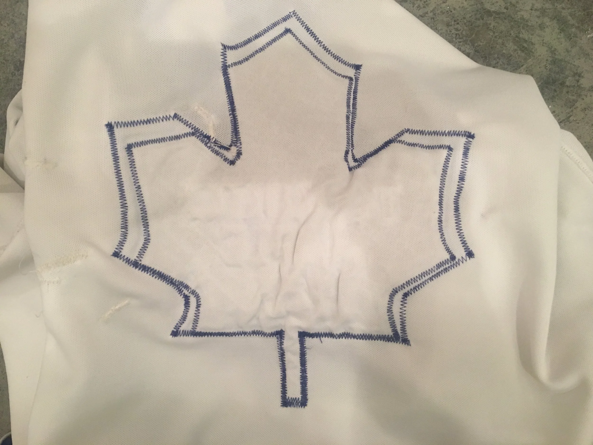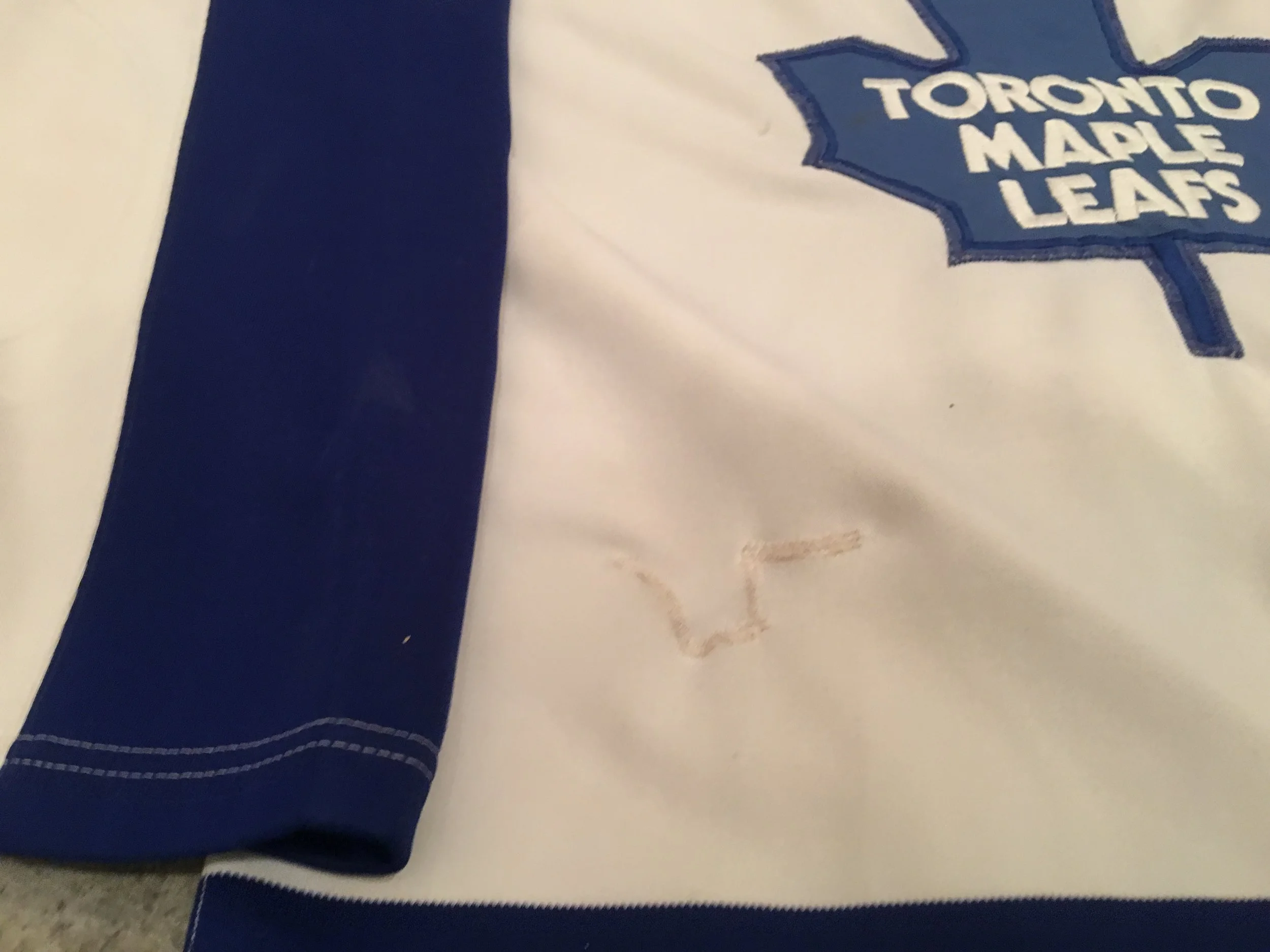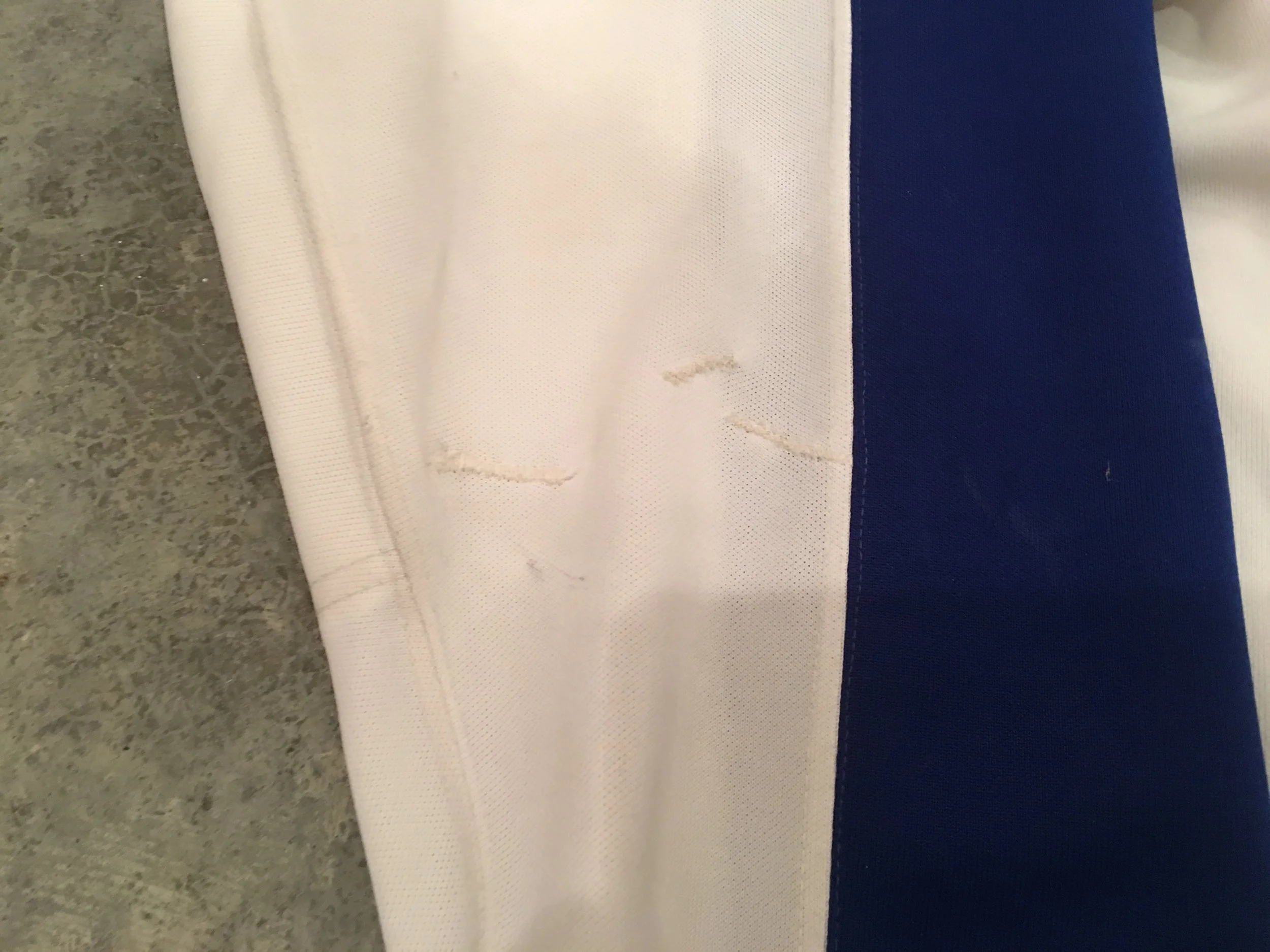 Description: This jersey from a four time Vezina winner shows amazing wear. It appears to have been recycled, as the nameplate has either been replaced or reattached, and the crest has been sewn over with a larger crest to account for the shrinking of the original crest. The fight strap has even been replaced. There are over a dozen long team repairs on the front of this jersey and more on the sleeves. It appears these thinner Maksa ultrafil jerseys didn't hold up well to the NHL use and required a lot of maintenance from the trainer.
