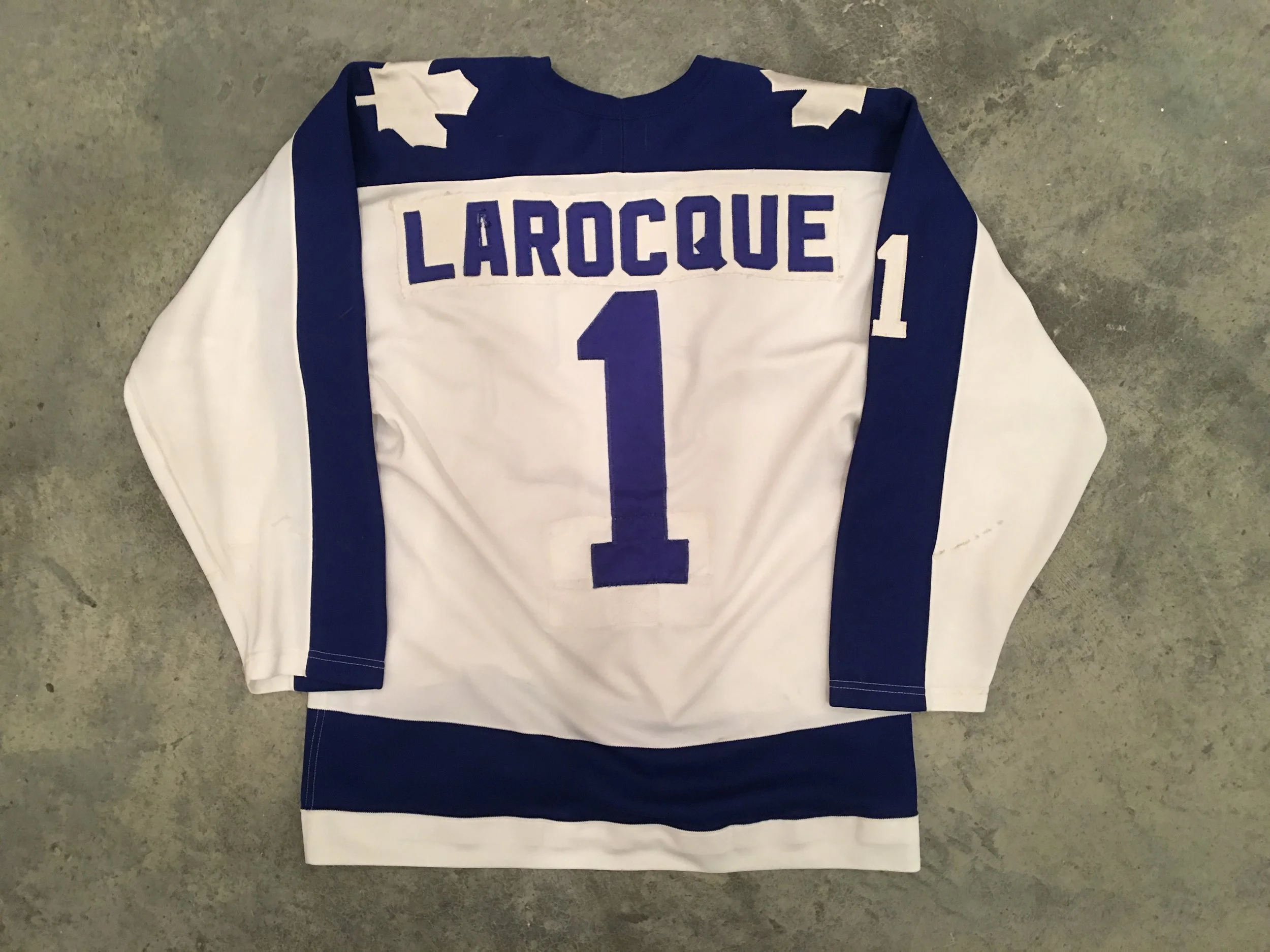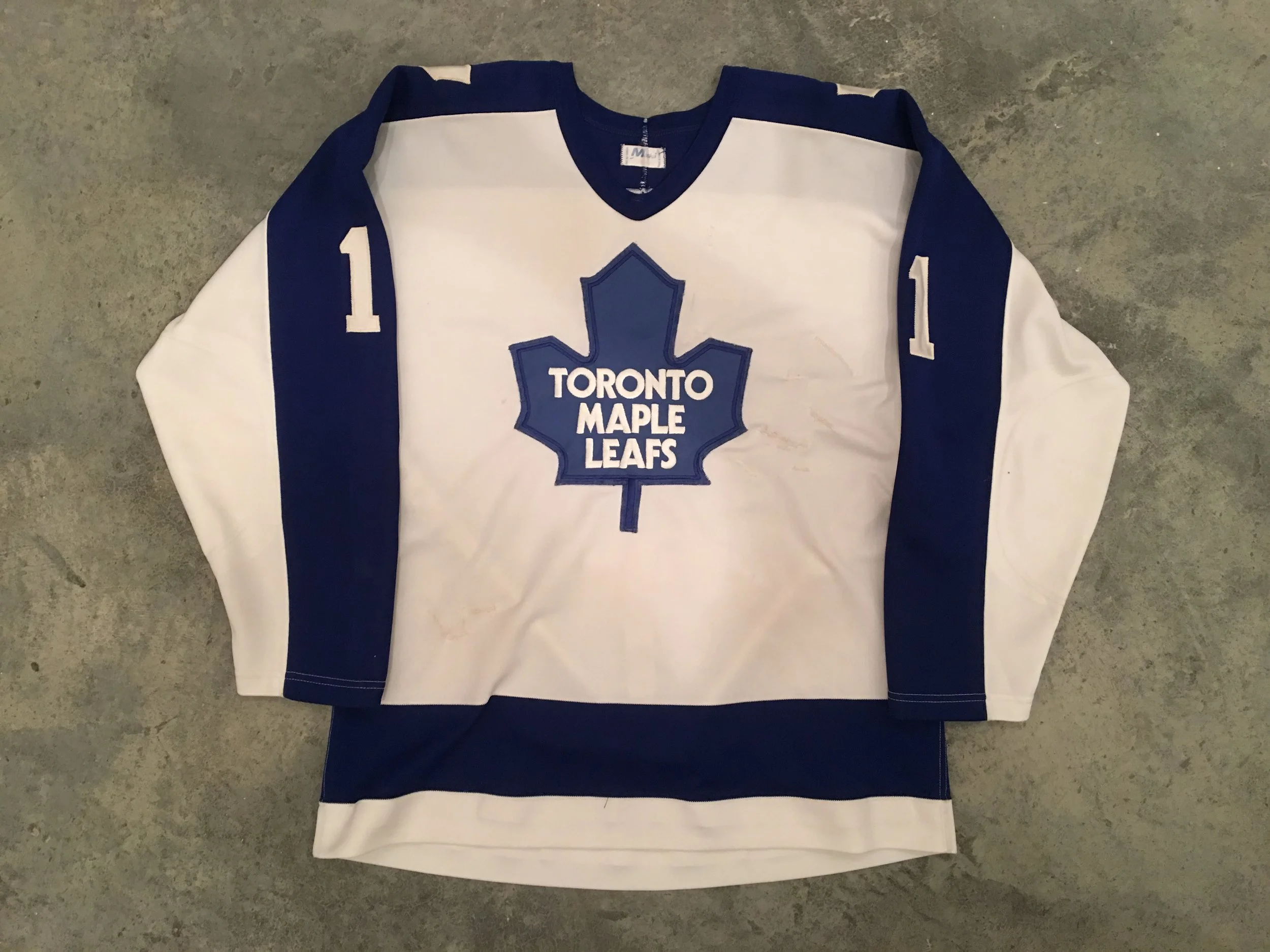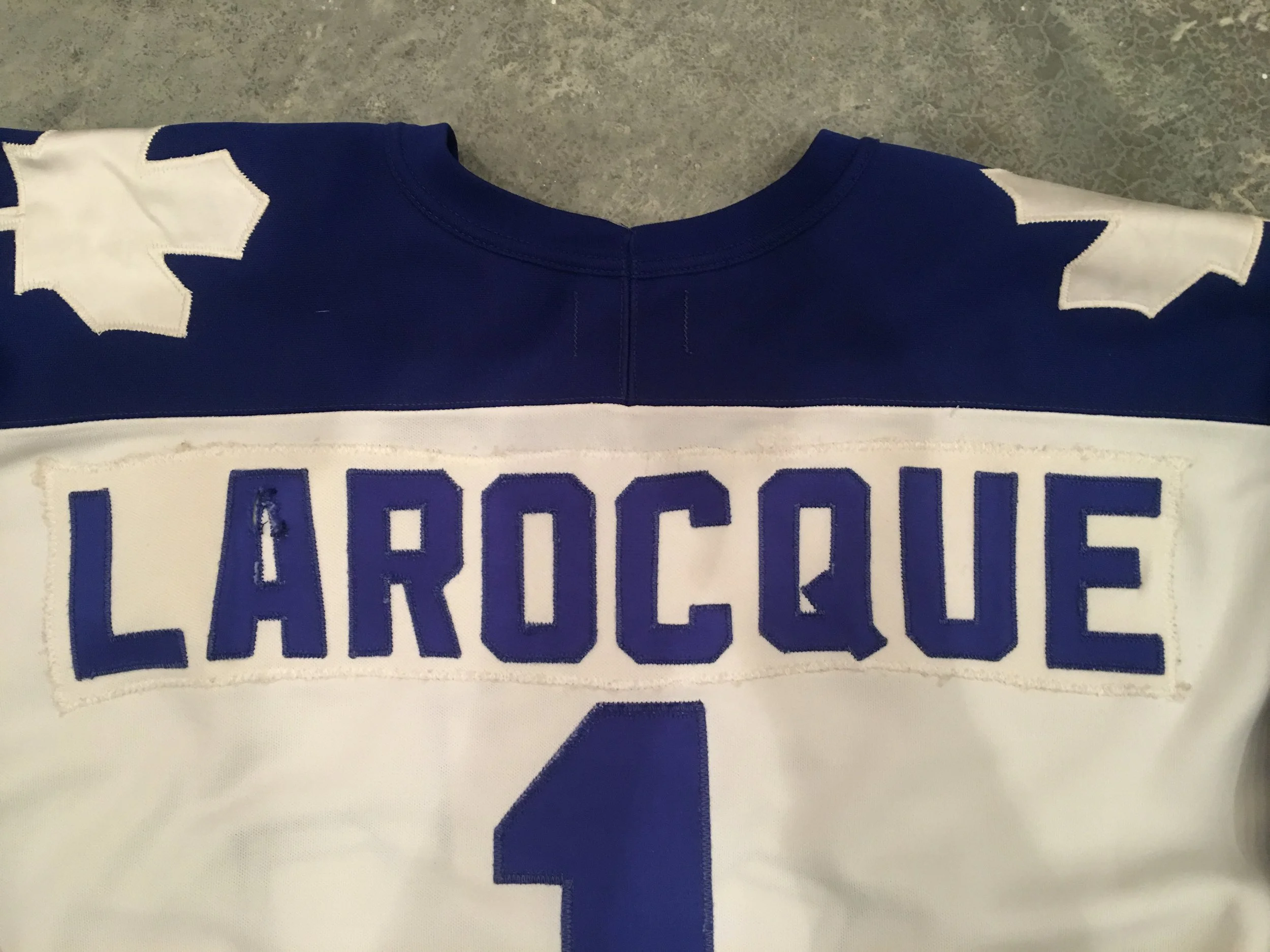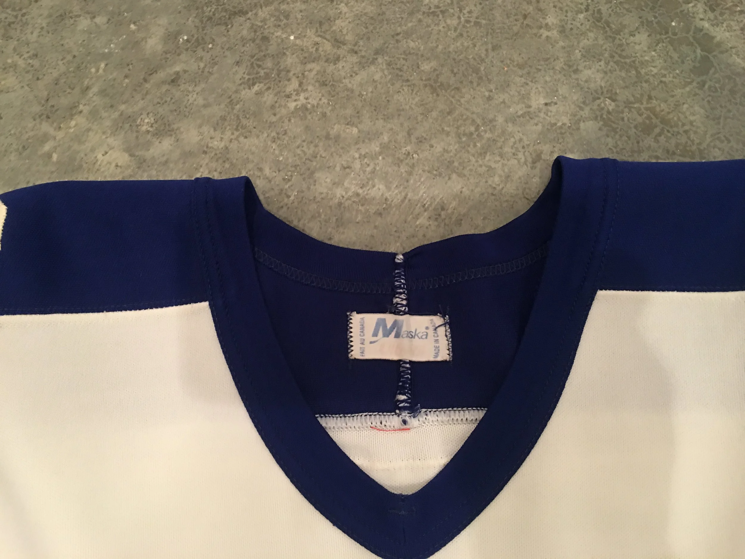 Description: This jersey from a four time Vezina winner shows amazing wear. It appears to have been recycled, as the nameplate has either been replaced or reattached, and the crest has been sewn over with a larger crest to account for the shrinking of the original crest. The fight strap has even been replaced. There are over a dozen long team repairs on the front of this jersey and more on the sleeves. It appears these thinner Maksa ultrafil jerseys didn't hold up well to the NHL use and required a lot of maintenance from the trainer.