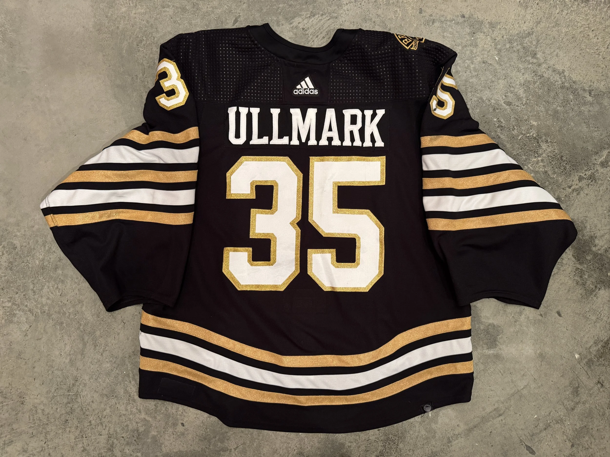 The jersey features several distinct puck marks on the white of the numbers and crest that match up nicely to images of Ullmark wearing the jersey in action, including a few goalie hugs! There is also nicely pilling on the right cuff.
