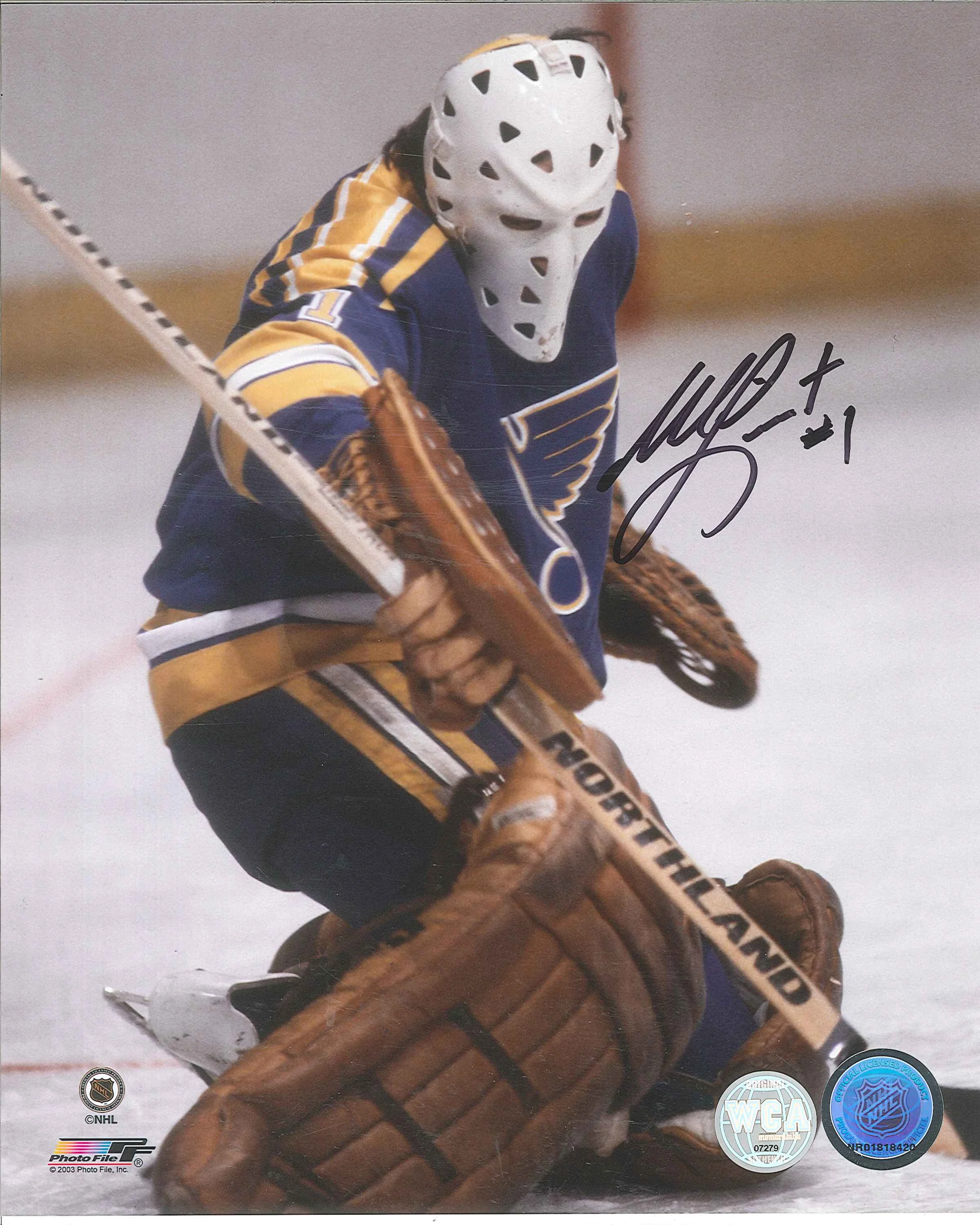 Description: From Classic Auctions: Likely the most successful goaltender to wear this style of Greg Harrison-made mask, Mike Liut helped it to become recognized by most as the “Mike Liut style”. After a couple of years with the WHA’s Cincy Stingers, big Mike became one of the best at his trade in the early 1980’s with St. Louis, being named to the NHL’s 1st All-Star Team in ’80-81 and winning the Lester Pearson Award as the league’s outstanding performer in the eyes of his peers. White-painted fiberglass mask shows excellent game use with some chips and scrapes, as well as repair to the slightly cracked base. Original elastic straps are present as is the yellow-painted back plate. Two photos and a hockey card (’83-84 OPC) will be included of Liut wearing the mask, which was originally part of the Richard Curry collection and obtained from him by our consignor, Brian Rogers. A classic style worn by a terrific goalie who racked up 293 NHL wins.
