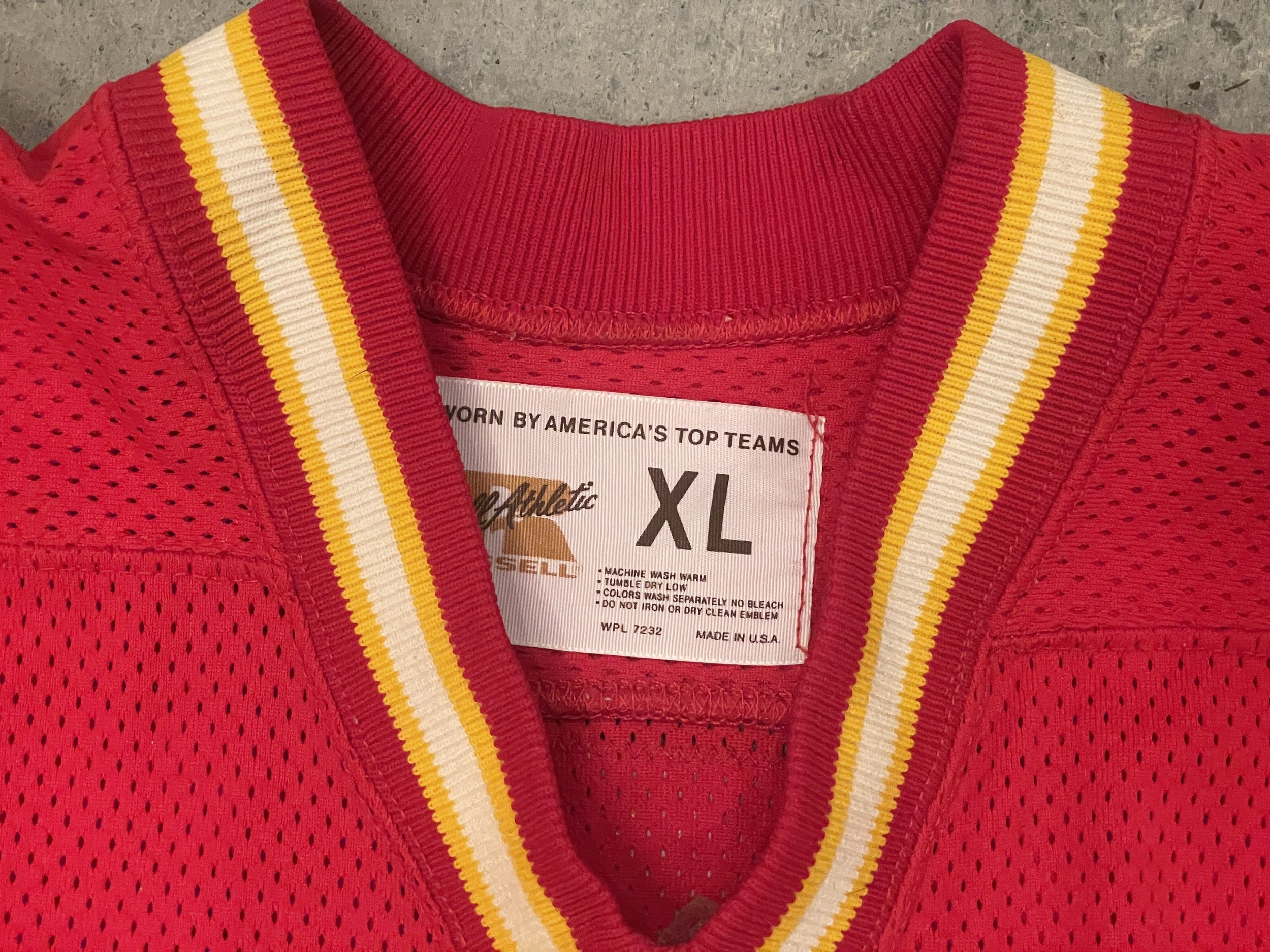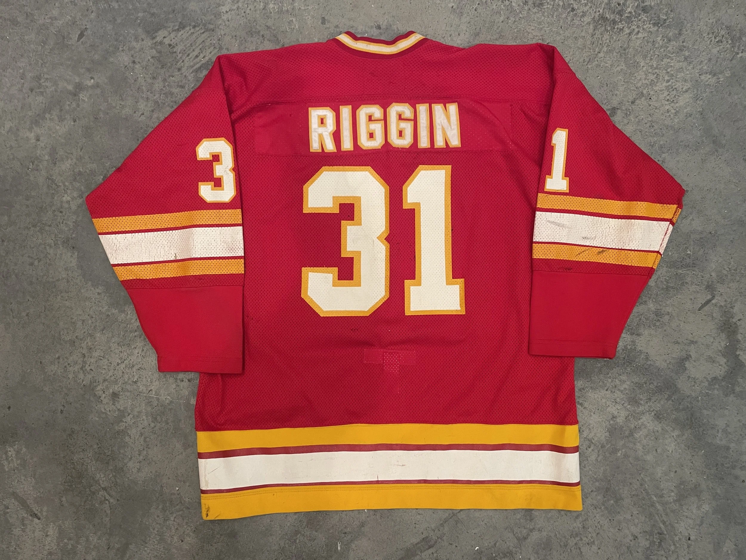 Description: This great Atlanta Flames jersey was worn by Pat Riggin is his rookie year with the Atlanta Flames. This was their final year in Atlanta before moving to Calgary. Riggin played in 23 games in his rookie year, going 11-9-2 with a respectable 3.21 GAA and .894 save percentage. The jersey shows good wear with many puck marks on the body and sleeves of the jersey. The mark on the hem matches up to a photo 1/17/1980 to Riggin wearing this jersey in action against the Colorado Rockies. A great jersey from this defunct/relocated franchise.