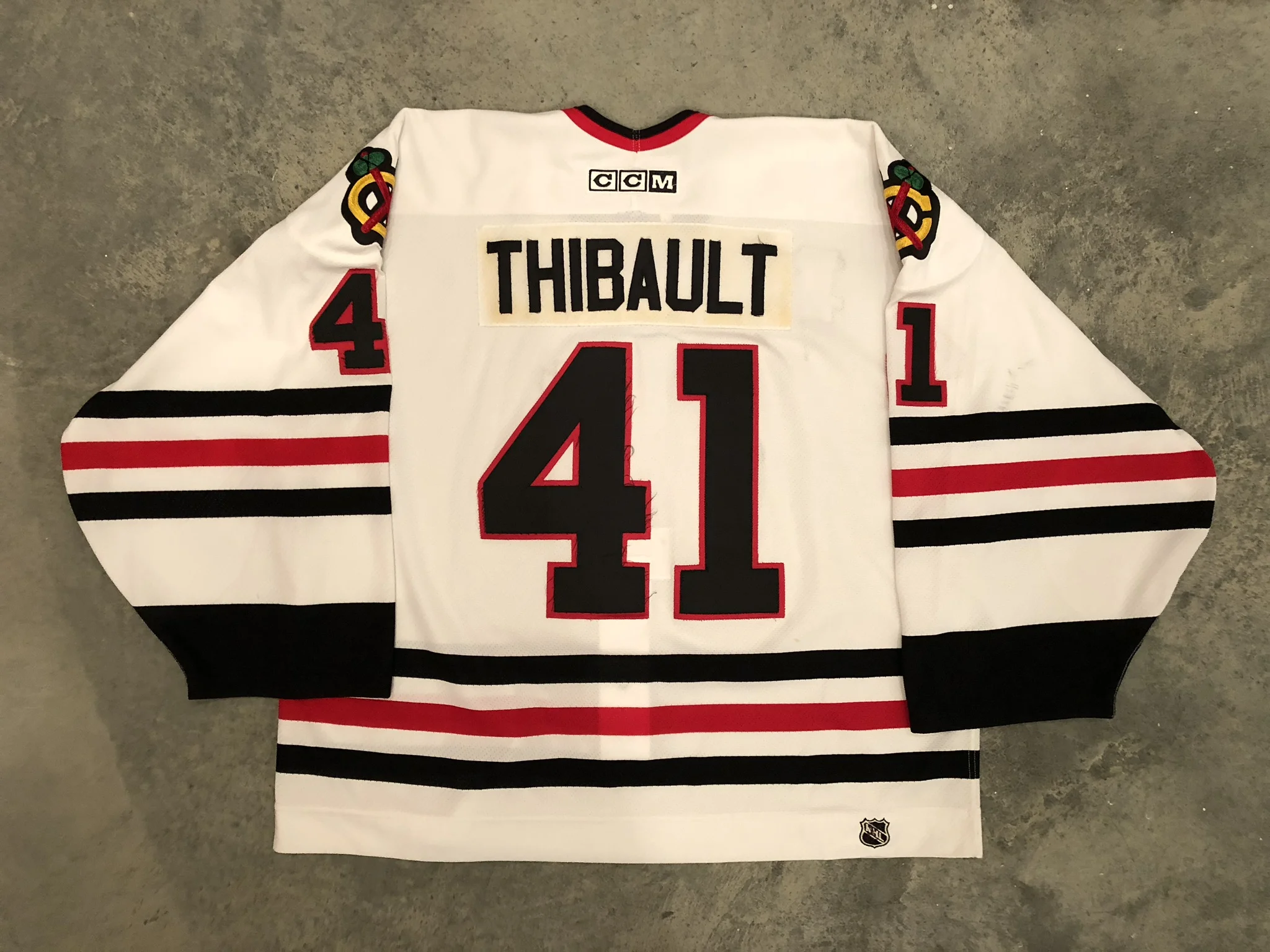 Description: This Thibault jersey came from one of their team auctions. It features the teams 75th anniversary patch on the right breast. There are good puck marks on the jersey and it shows light pilling. The numbers and patch show light fraying around the edges as a result of use and washing. Team documentation.