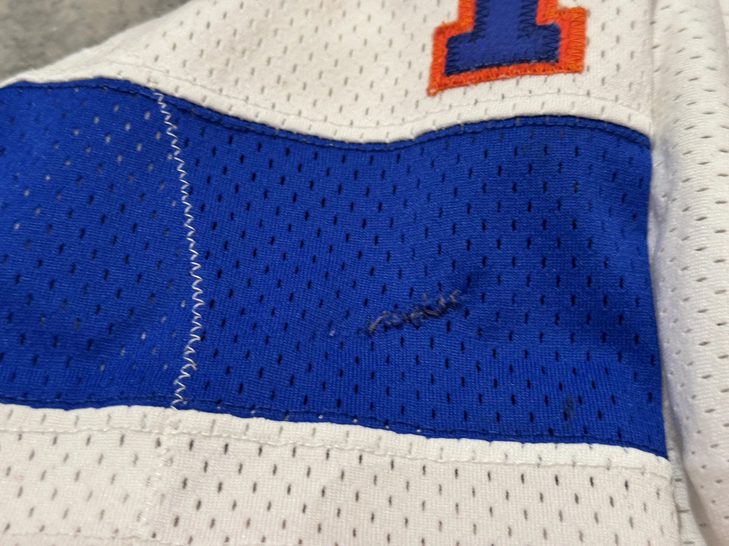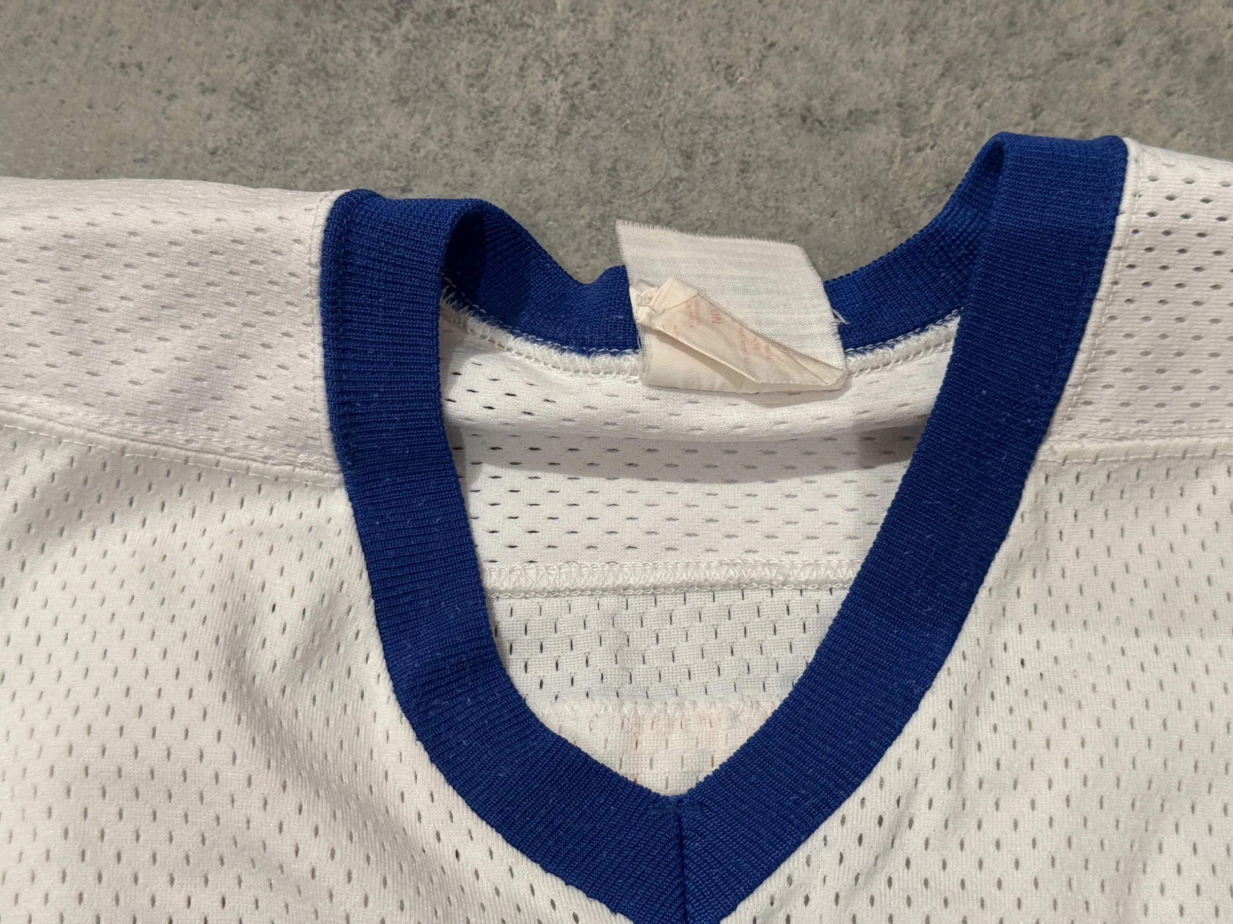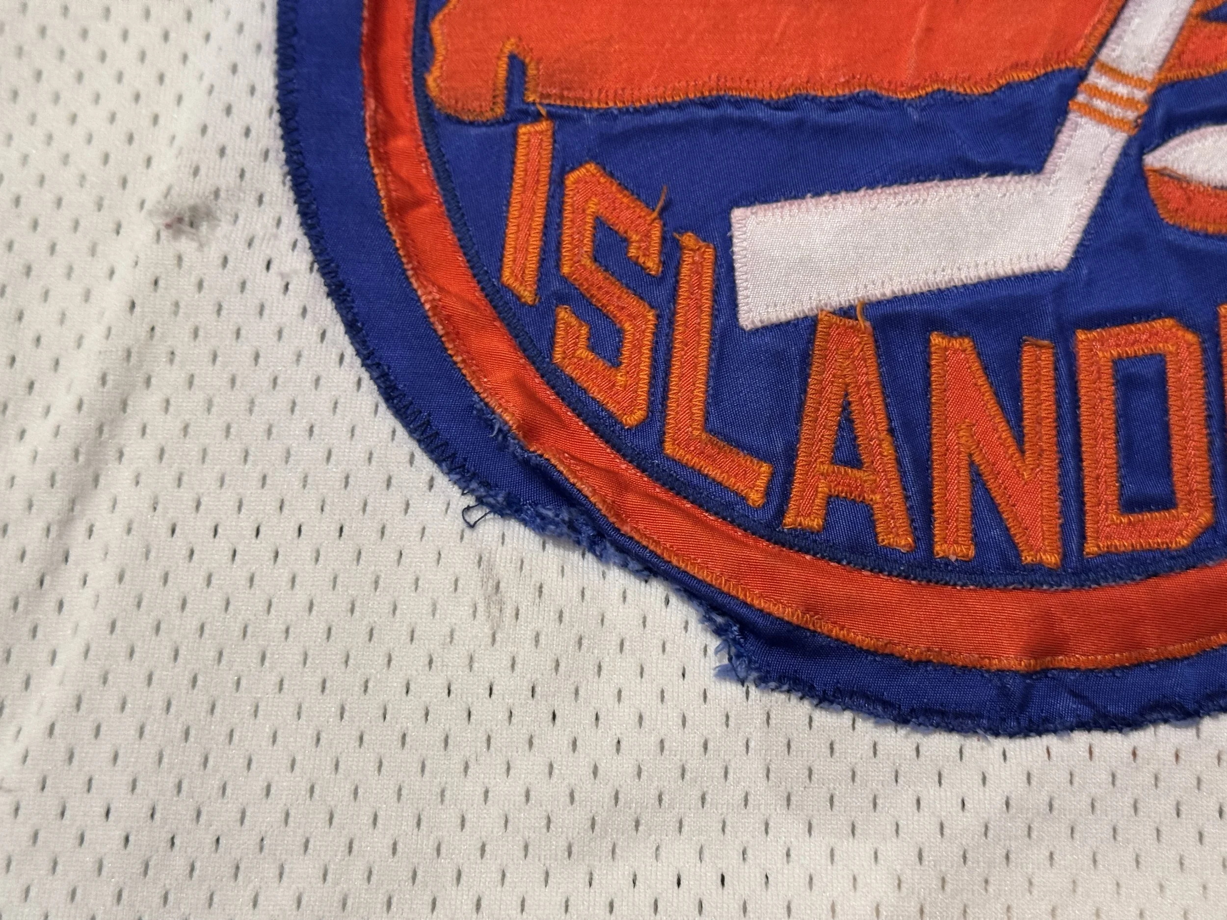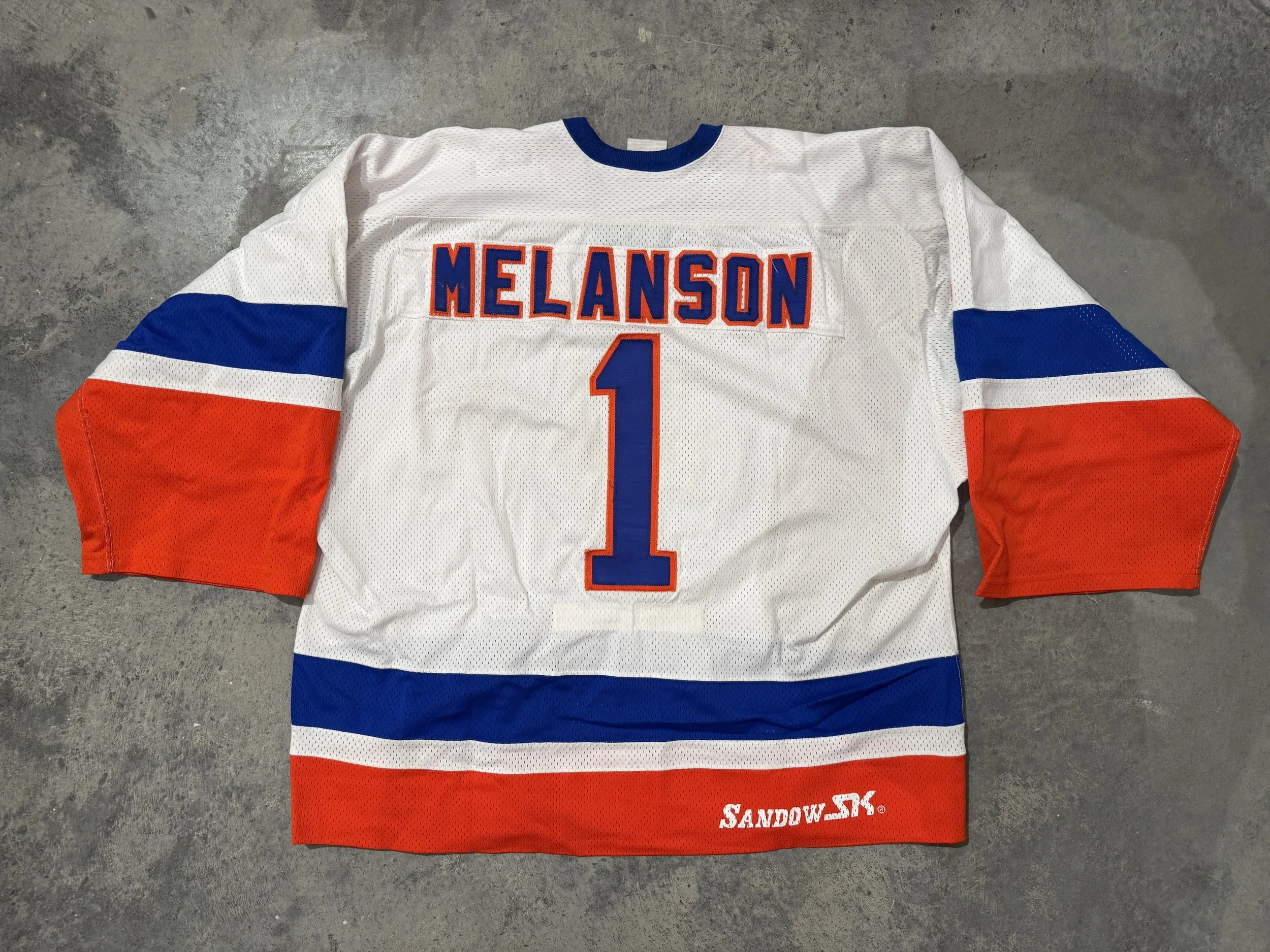 Description: 1982-83 Roland Melanson Game Worn Sandow SK Sweater. Rollie won three Stanley Cups with the Isles and was a durable goalie splitting time with Billy Smith on those Cup Teams….Second Team NHL All Star in 82/83 where he shared the Jennings Trophy with Smith and was runner up for the Vezina Trophy. The game wear on this mammoth sized goalie cut sweater consists of stick and puck marks, goal post paint transfer, inner pilling, trauma and subsequent team-sewn repair work to the crest and a team-sewn repair on the right sleeve. Jersey is photo matched as well and can provide photo to those interested. Rollie was spectacular while wearing this sweater as he posted a career best 24 Wins with a 2.66 GAA while leading the league with a .909 save percentage. He finished runner-up to Pete Peeters for the Vezina Trophy as the NHL’s top Goalie, won the William M. Jennings Trophy, was named 2nd Team NHL All Star and helped the Islanders to their 4th consecutive Stanley Cup.