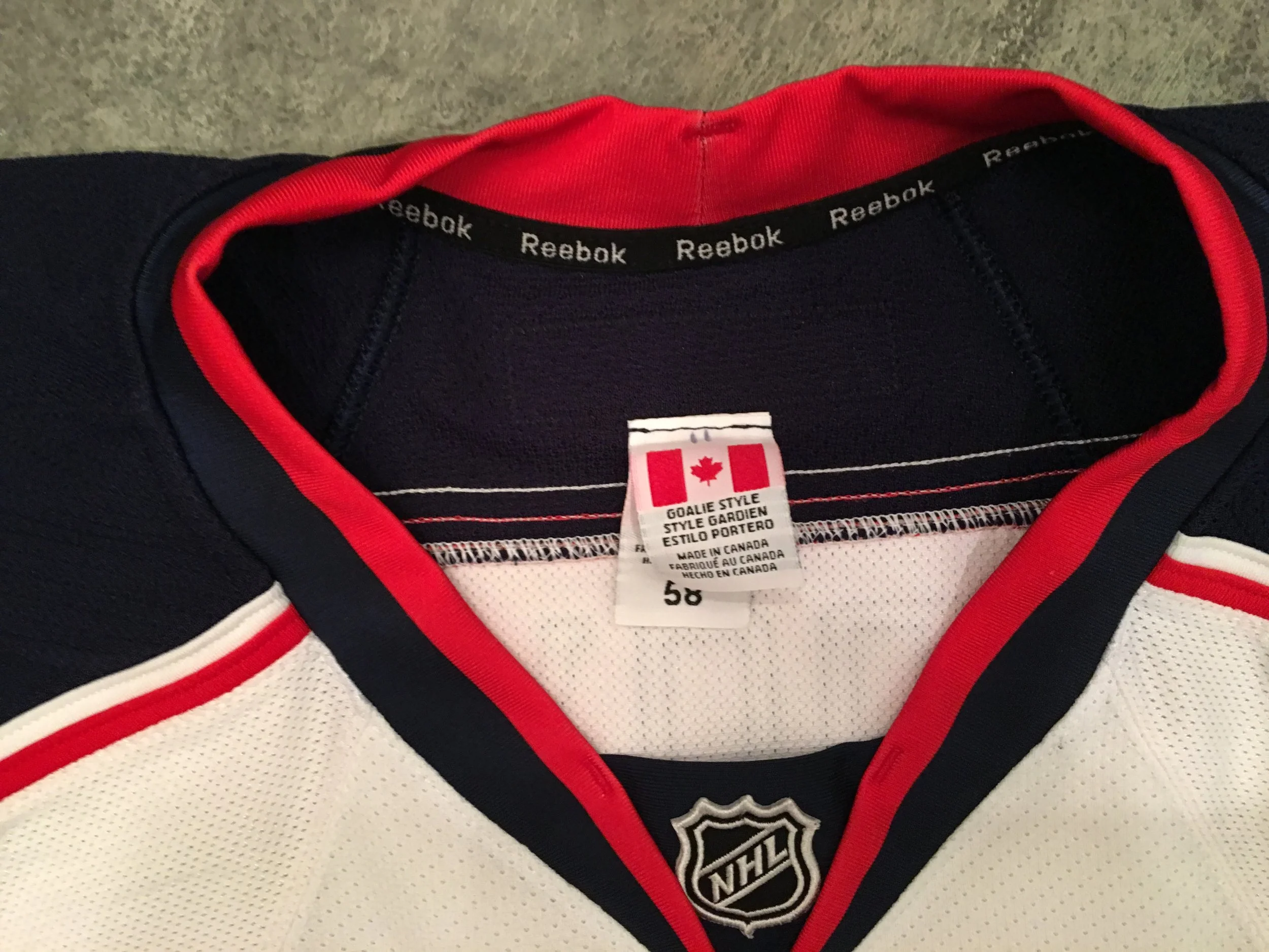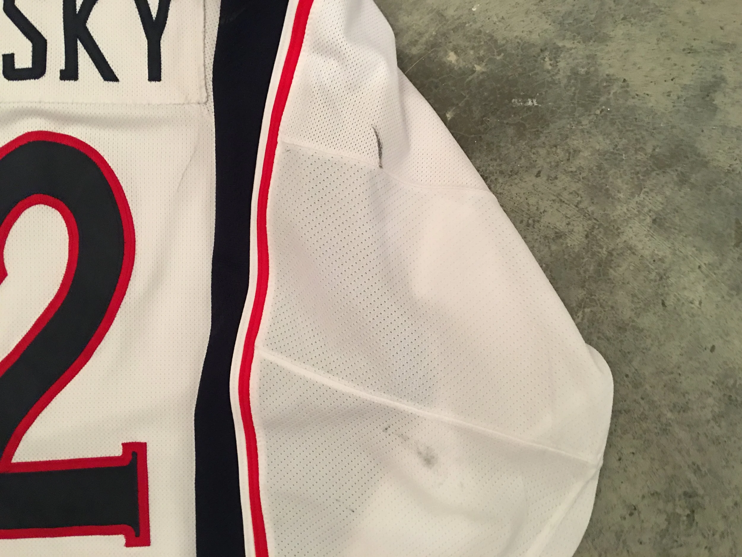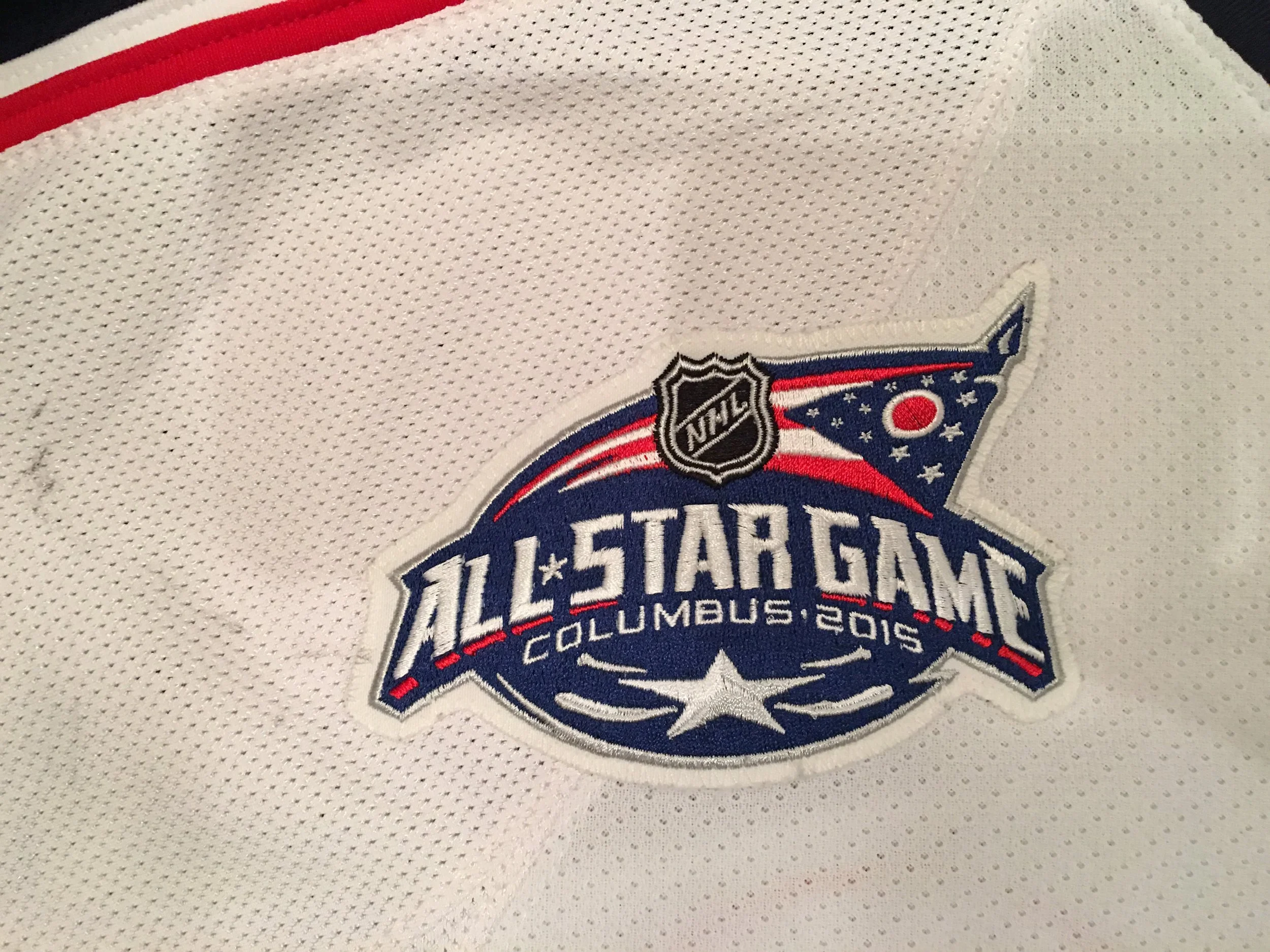 Description: This jersey, worn by this two time Vezina Trophy winner, shows nice wear with plenty of visible puck marks on the body an sleeves. The 2015 NHL All Star Game sits on the right breast, and the puck mark on the right side of the patch can be matched to photos of Bobrovksy wearing this jersey in action. Bobrovsky wears a different jersey per period, so I believe this jersey was worn in second periods throughout the season.
