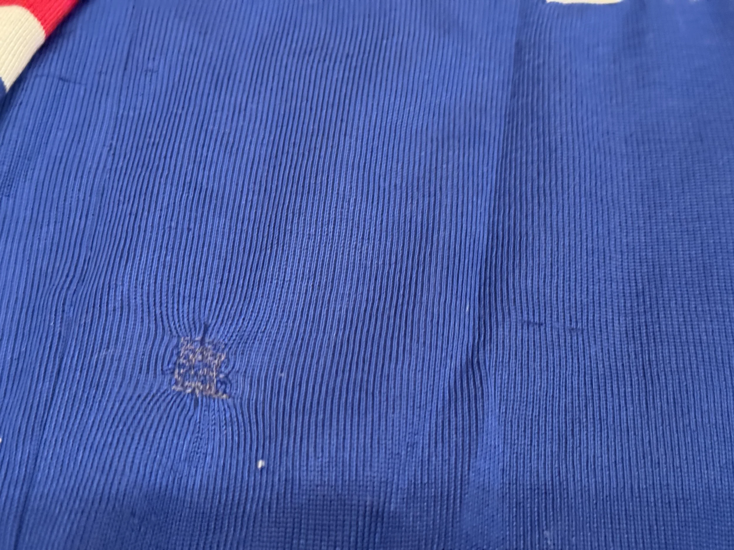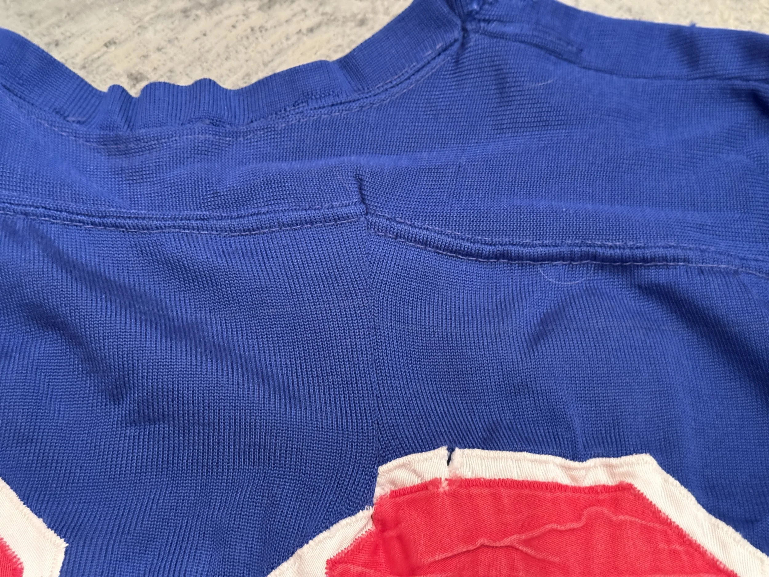 Description from Gamewornauctions: This blue durene gamer by Cosby was worn by Terry Sawchuk during the 1969-70 NHL season, his last NHL season. Gilles Villemure took over the reigns as Ed Giacomin’s sidekick with the Rangers following Terry Sawchuk’s untimely death at age 40 on May 31, 1970, following a fatal fight with teammate Ron Stewart in April of 1970. Gilles Villemure then wore this jersey during his 1970-71 Vezina Trophy winning season. Lastly, based on the tagging, it is also possible that Don Simmons wore this jersey while with the Rangers prior to Sawchuk’s arrival to New York.