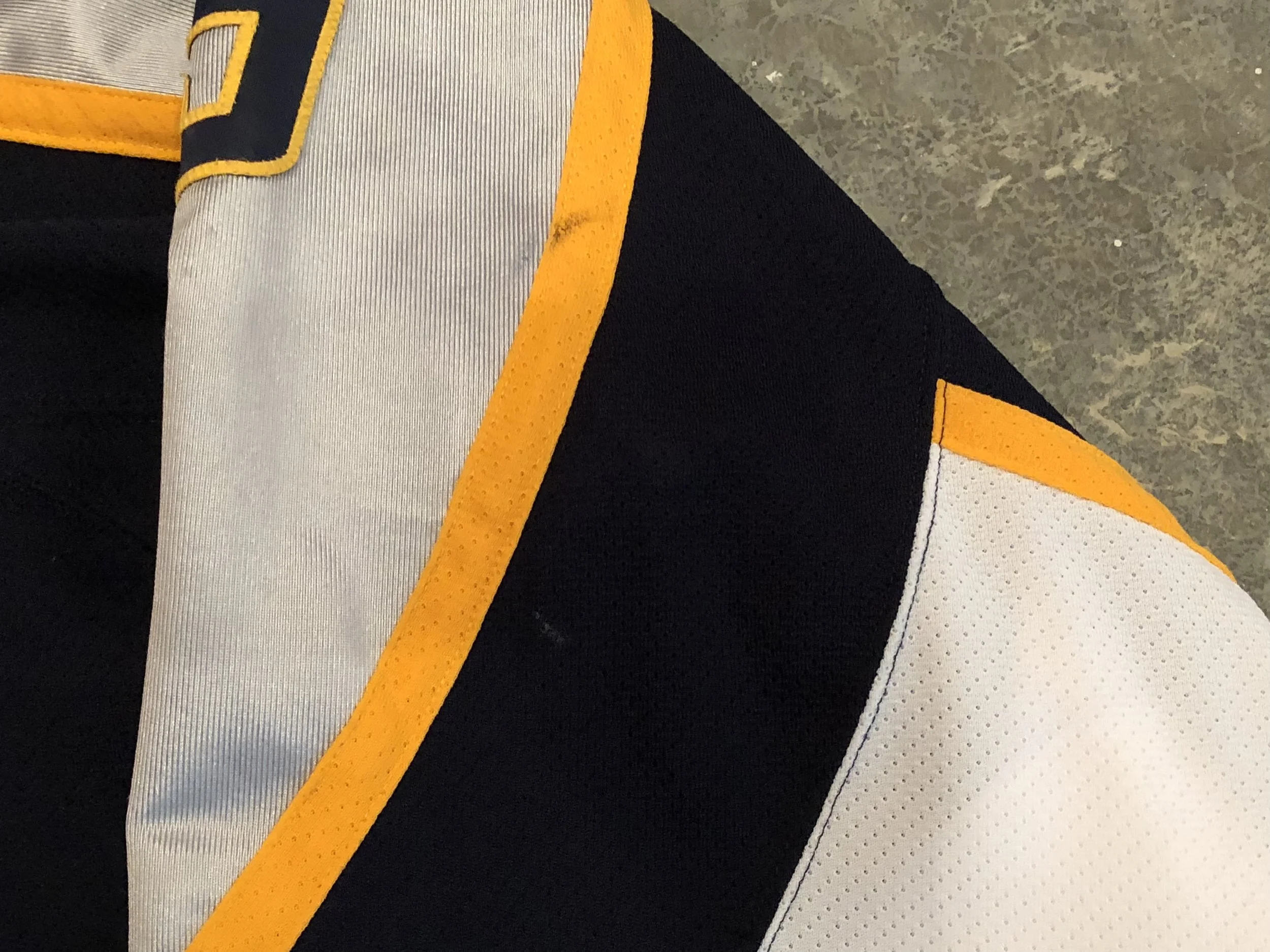 Description: This jersey shows moderate use with a couple puck marks and red post paint visible on the white parts of the sleeves. The wear is actually quite nice considering the Predators only wore their set 3 home jerseys for four games. The game image below from March 20th, 2003 shows Vokoun wearing this jersey.