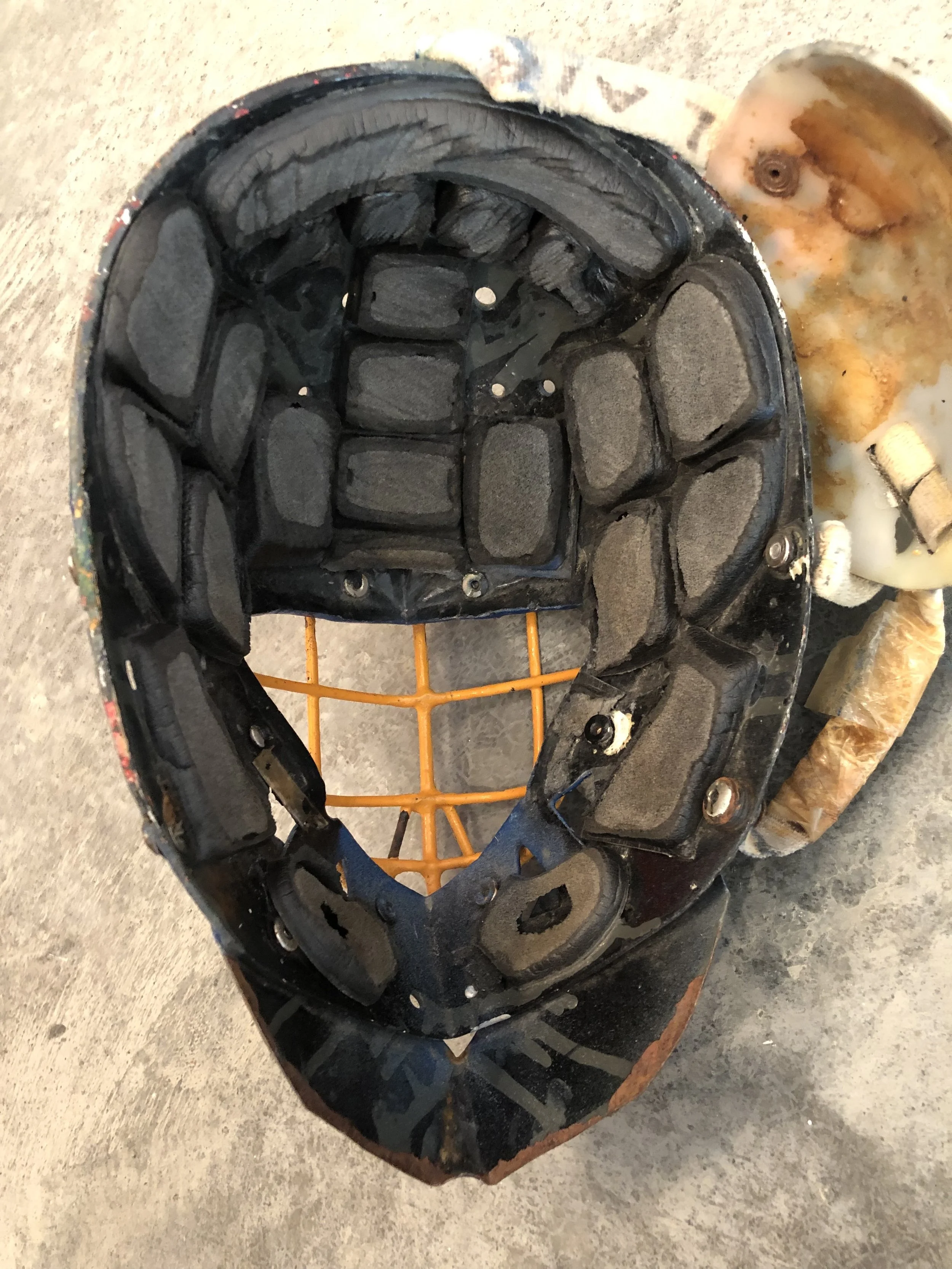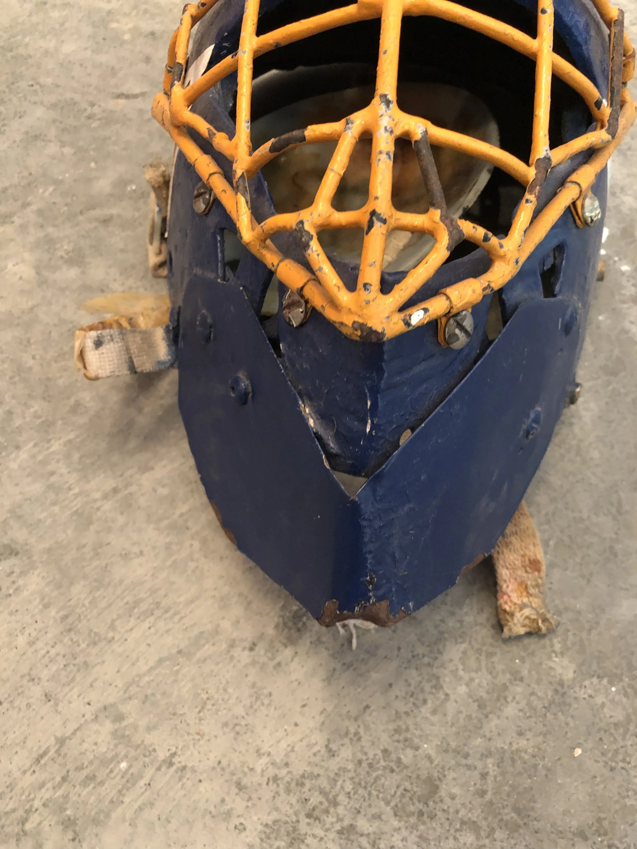Description: This unique mask appears to have a fiberglass shell and a metal chin extension. The cage appears to be hand welded and the paint is quite crude. Iād love to get more info on who might have made and worn this mask.