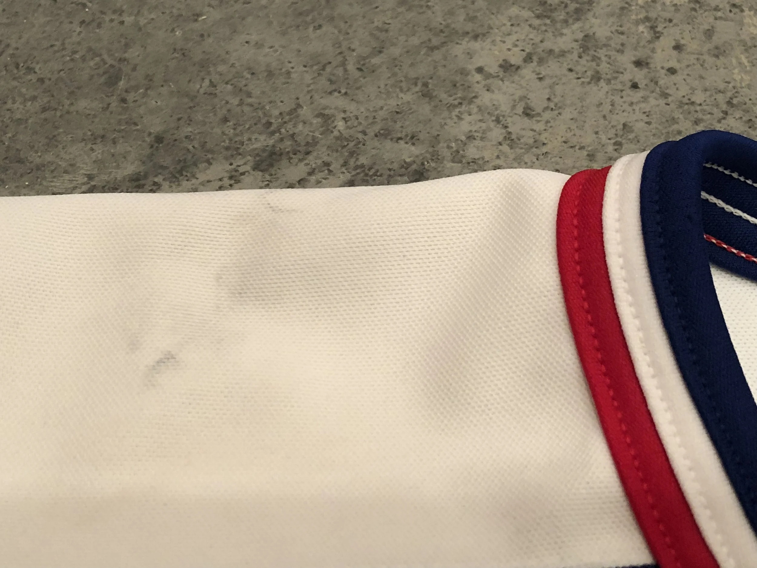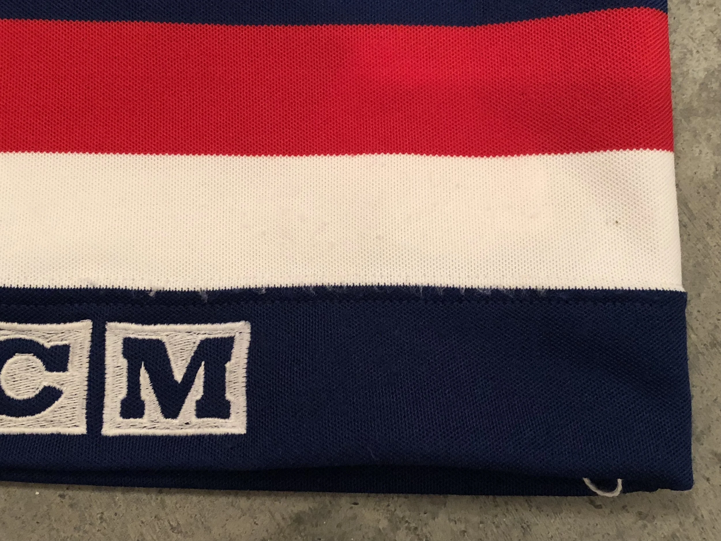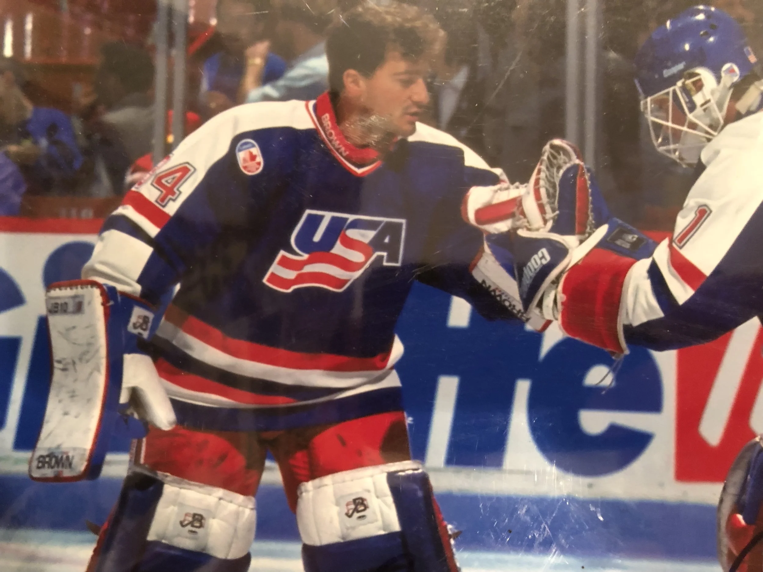 Description: Vanbiesbrouck only played one game in the 1991 Canada Cup, a 4-3 victory over Finland on 9/9/1991. Fittingly, the jersey show light wear, with a couple light marks on some pilling at the neck. The puck mark on the crest can be matched to the photo below of Beezer wearing the jersey.