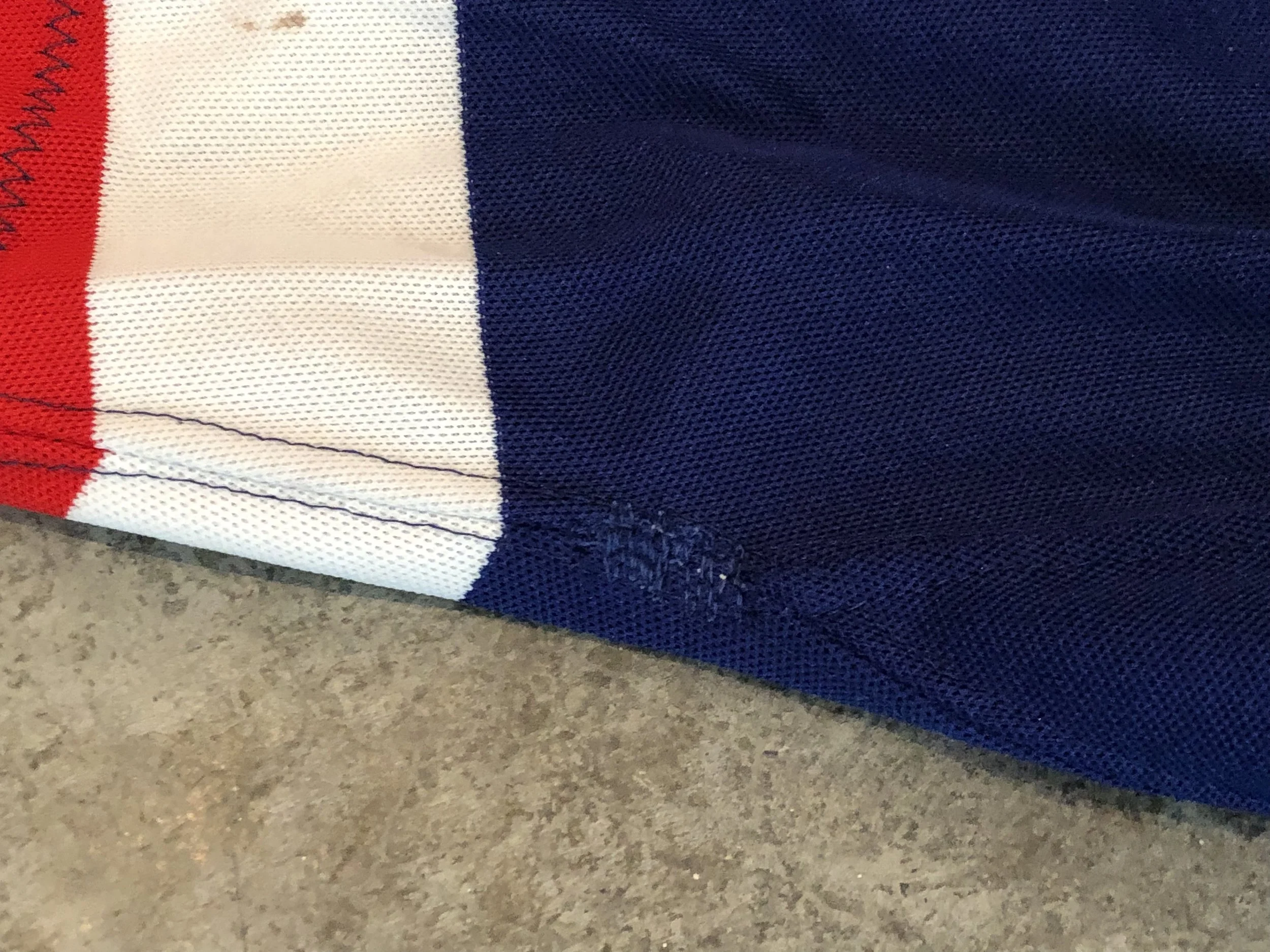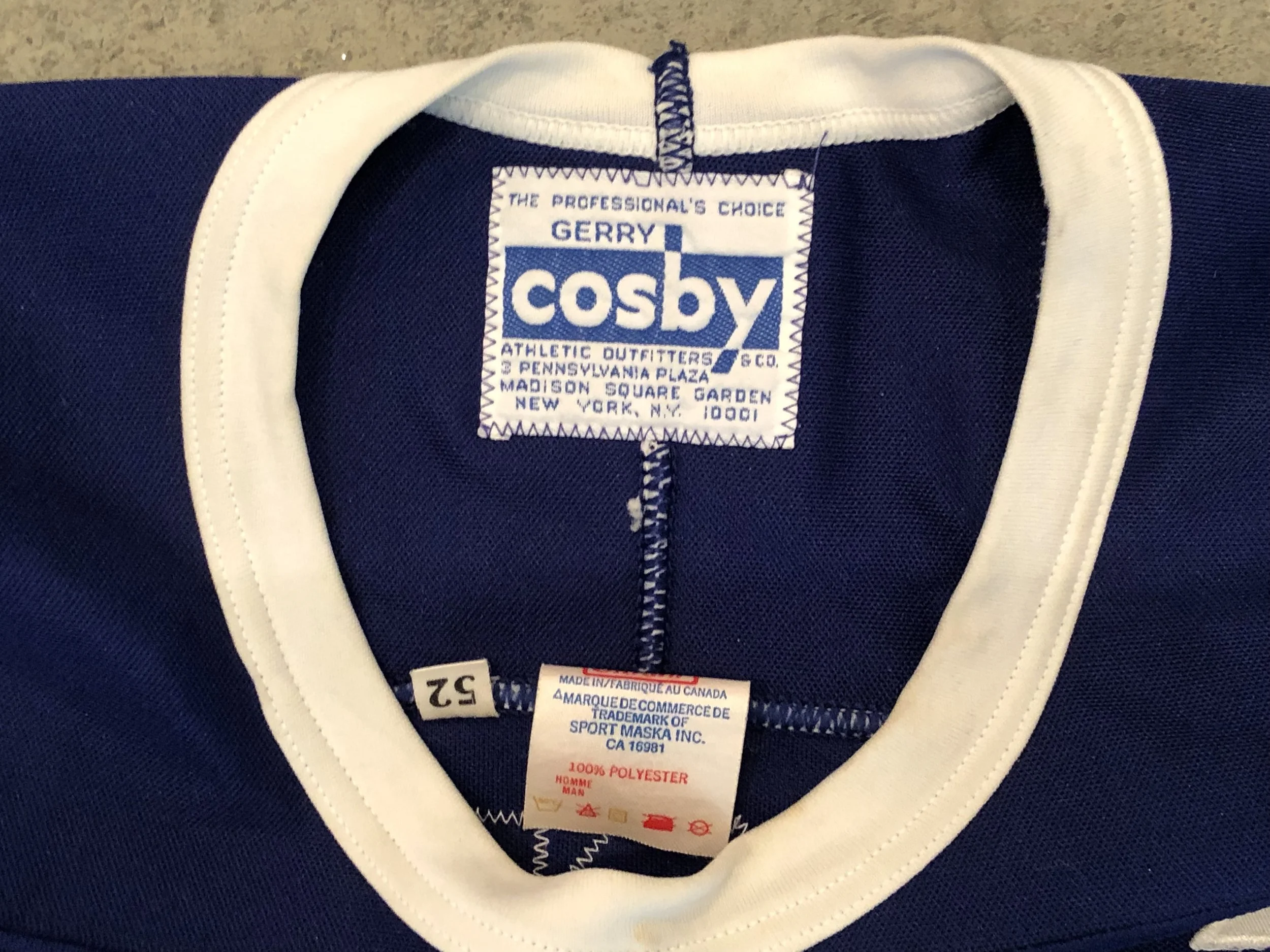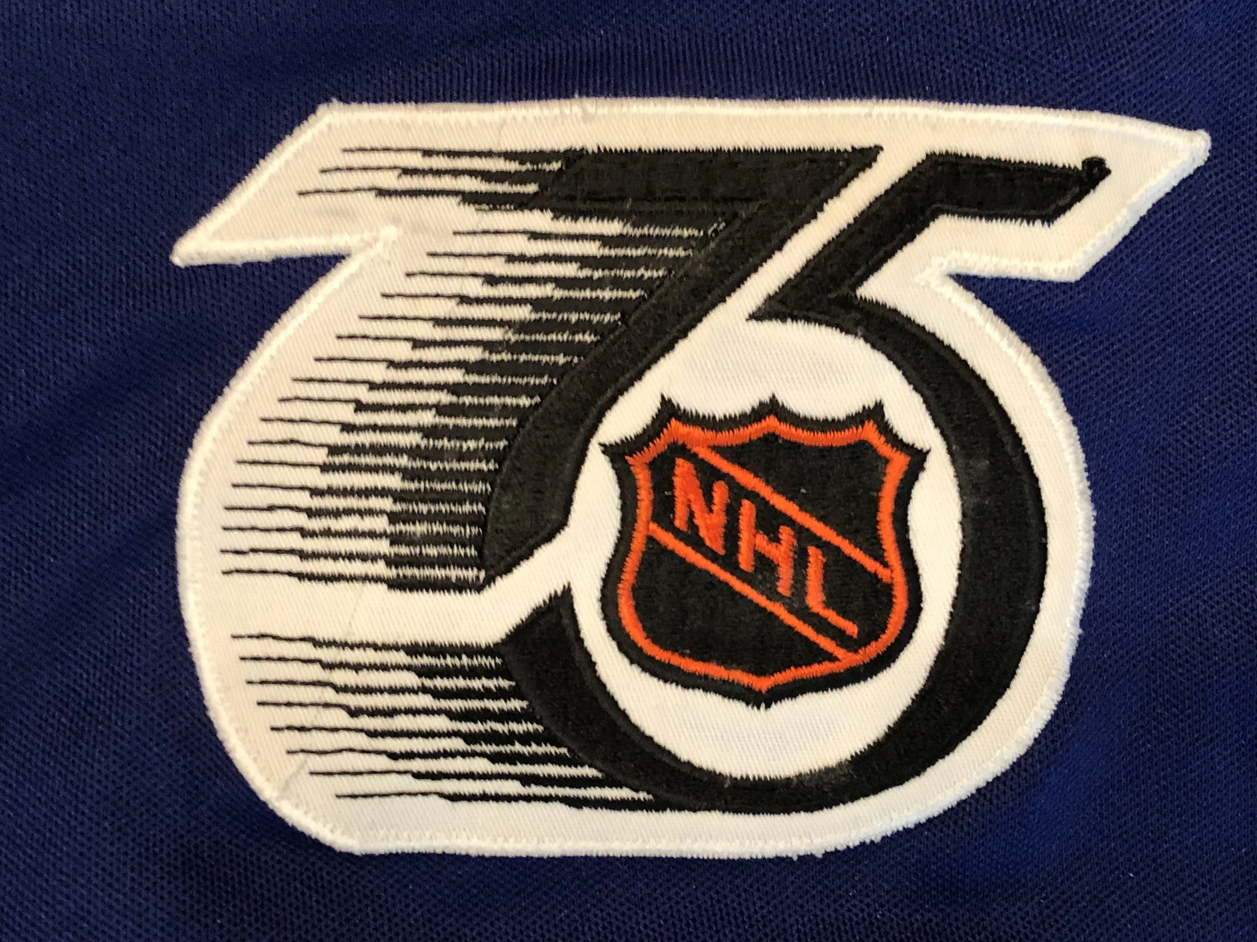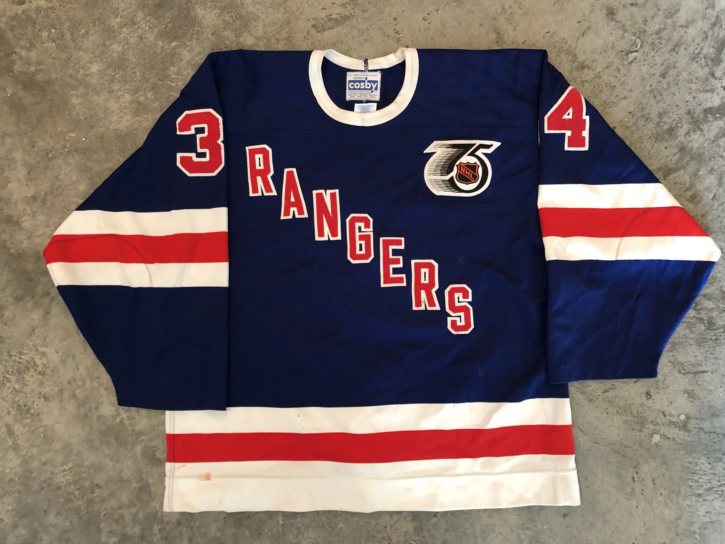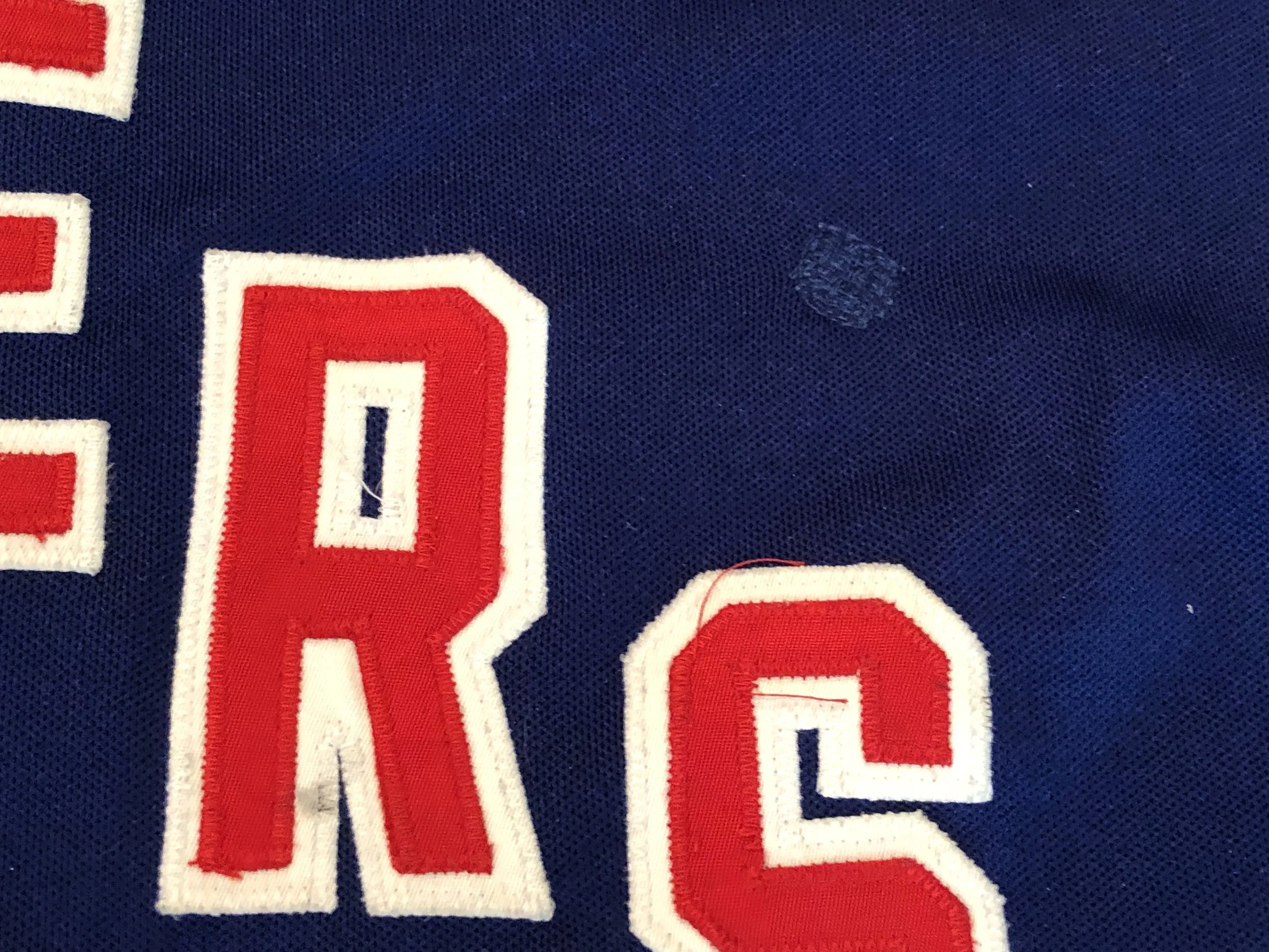 Description: This might be my favorite jersey I own. These jerseys were worn by the Rangers for 13 games this year and Beezer played in all but a few. This jersey shows amazing use, with several repairs, many visible stick marks, and post paint on the back, and what might be board paint on the front hem. The photo match on this one is kind is to the stitching on the 75th patch. The photo is from the cover of a Ranger's game night, but it is a little out of focus. However, the stitching of the black lines on the 75th anniversary patch is a little weird, and the spacing matches up perfectly to the jersey.